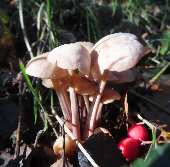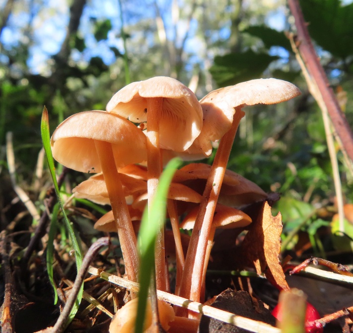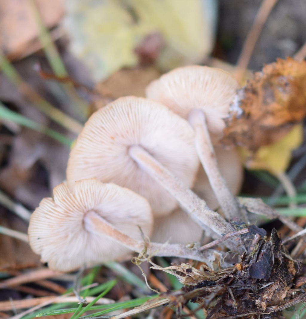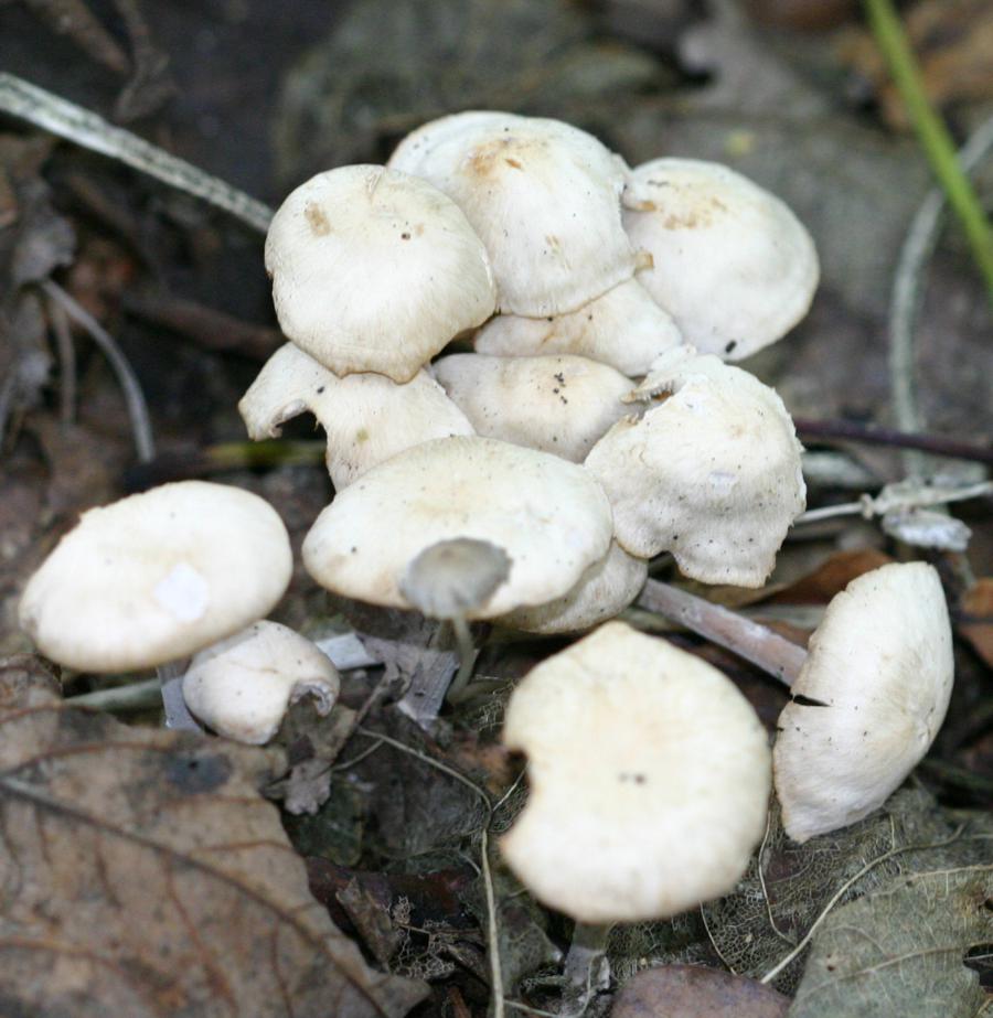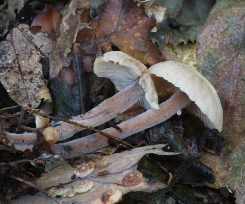 Cap 3 to 5 cm, flesh colour to brownish. Gills very crowded, white to pinkish brown. Stem (stipe) slender, usually furrowed or compressed, covered with a distinctive lilac grey bloom.