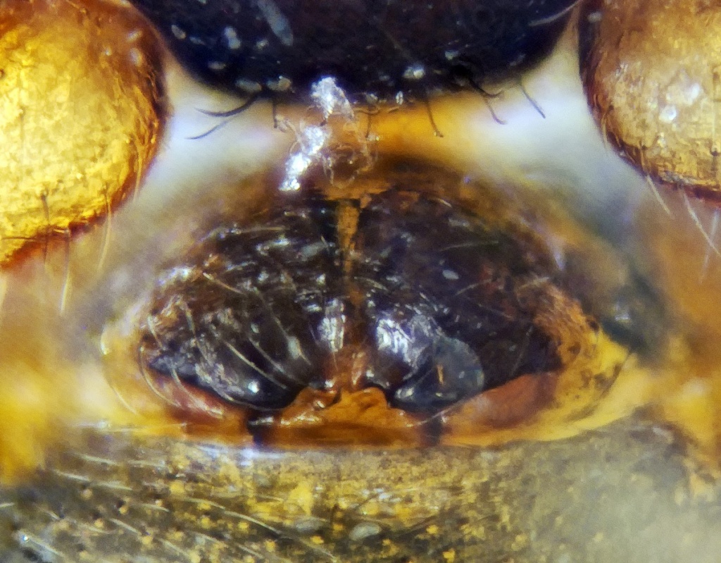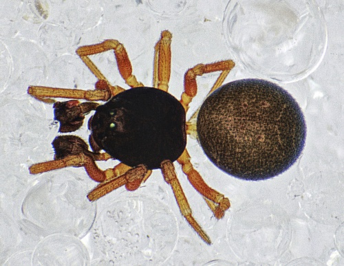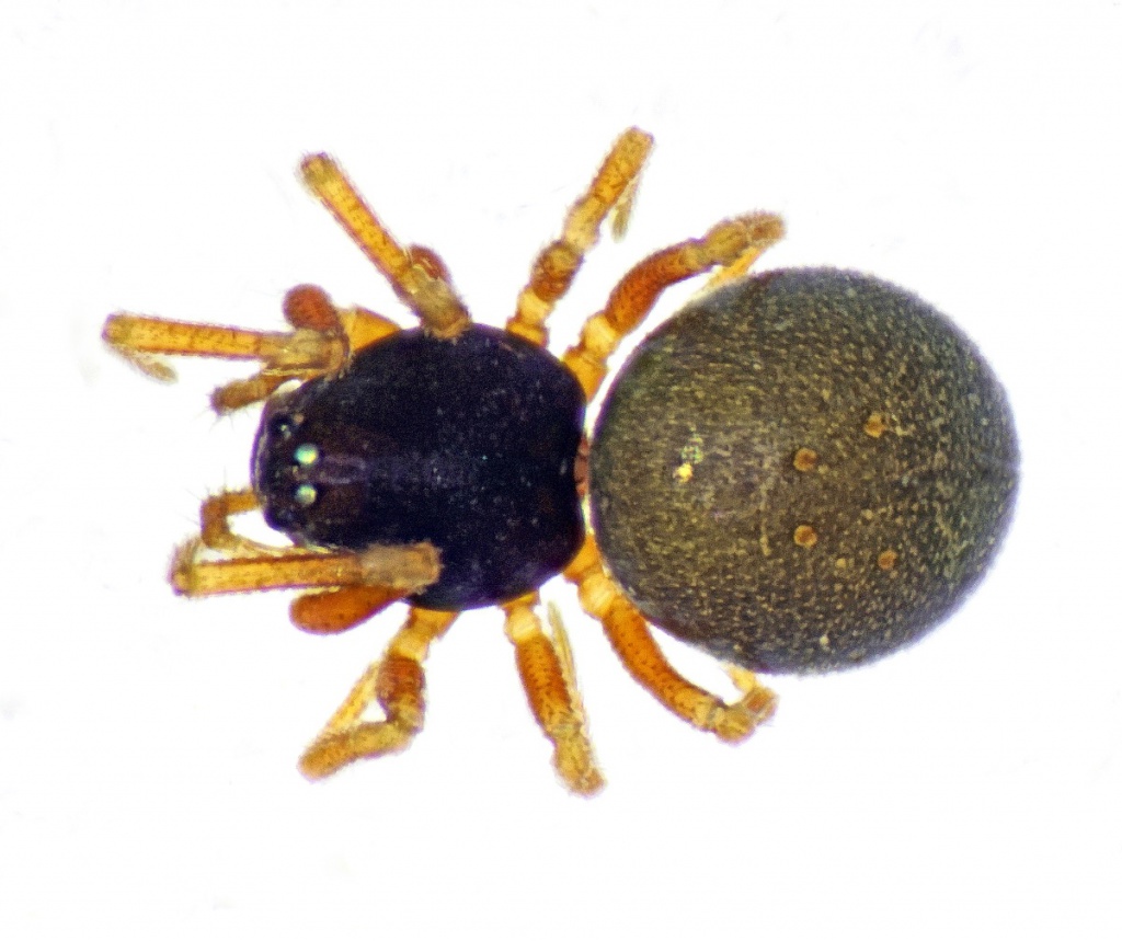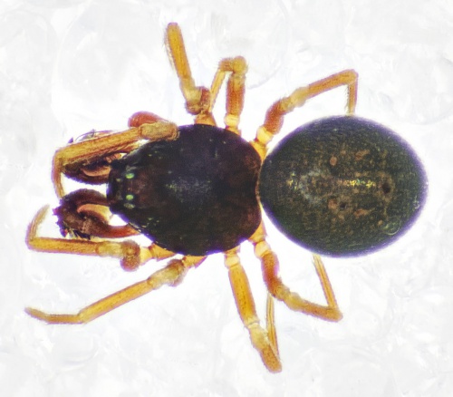 Males 1.5 to 1.9mm, females 1.5 to 2 mm. Prosoma black-brown. Legs yellow-orange to brown. Opisthosoma dark grey to black with distinct impressed dots.