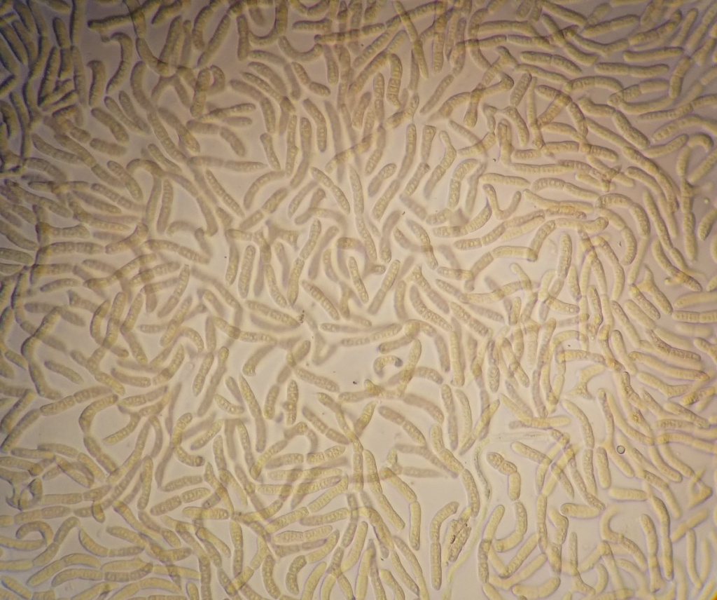 Dacrymyces stillatus has two forms. The asexual state is a soft, reddish-orange globular cushion, and seems to be the most commonly recorded state. Under the microscope, there is network of fragmented hyphae and disarticulating into septate arthrospores. The sexual state is blob or disc shaped, sometimes develoing brain-like wrinkles. It is translucent and pale yellow, and has a firm, rubbery and gelatinous texture. Under the microscope, the internal matrix is composed of hyphae with distinctive forked basidia, each bearing two spores. Both states may be found together in the same substrate.