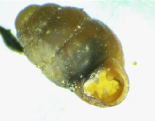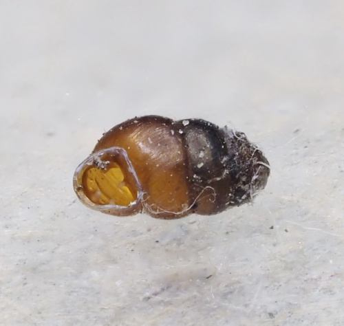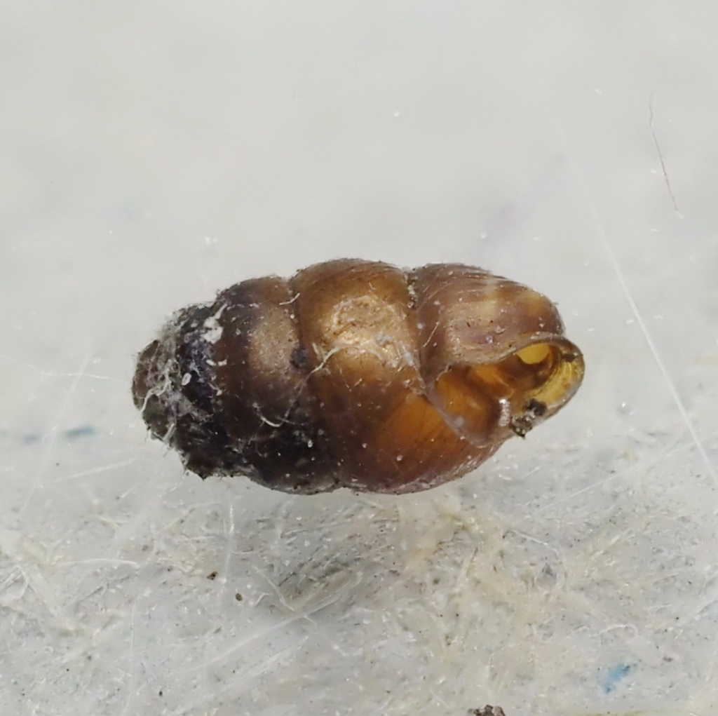 This is a very small species the shell being about 2 mm in length. It is mid brown in colour with 4 to 7 fairly prominent teeth. The shell surface is dull to slightly glossy and often quite silky in appearance. Typically there is a bulge in the shell behind the mouth lip.