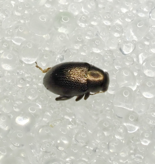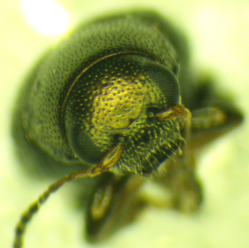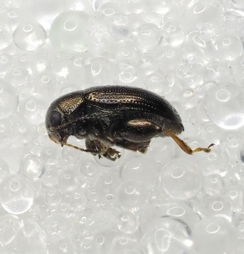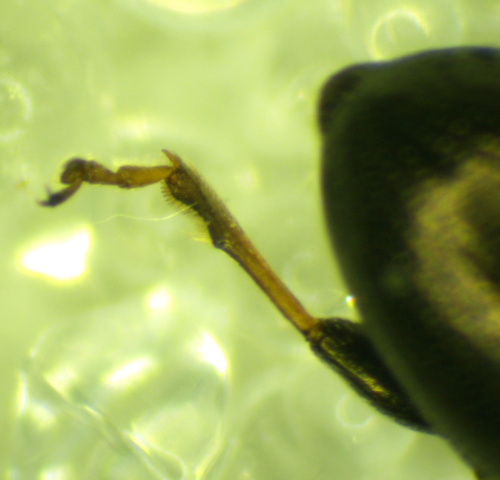 1.6-2.3mm. The genus can be recognised by the external tooth on both the mid and hind tibia. Bronze uppers (can be coppery or metallic green). Antennal segments 1-5 are pale then black after this. Legs are pale brown but with darker femora. The punctuation on the elytra do not follow neat, straight lines, particularly near the centre. See ID guidance below for more details.