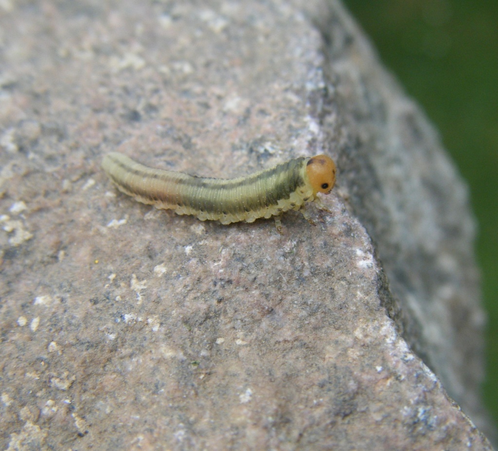The larvae of the sawfly Sciapteryx consobrina feed on members of the Ranunculus family and on Moschatel . Sciapteryx consobrina larvae are highly variable both in colour and black patterning. The ground colour can vary from yellow, grey, green to absolutely black with the complete pattern of the black spots on the one hand to the specimens with the black spots completely missing on the other hand. Likewise, the black head pattern is also highly variable varying from black headed larvae to the quite orange headed larvae with all conceivable intermediate variants between them.