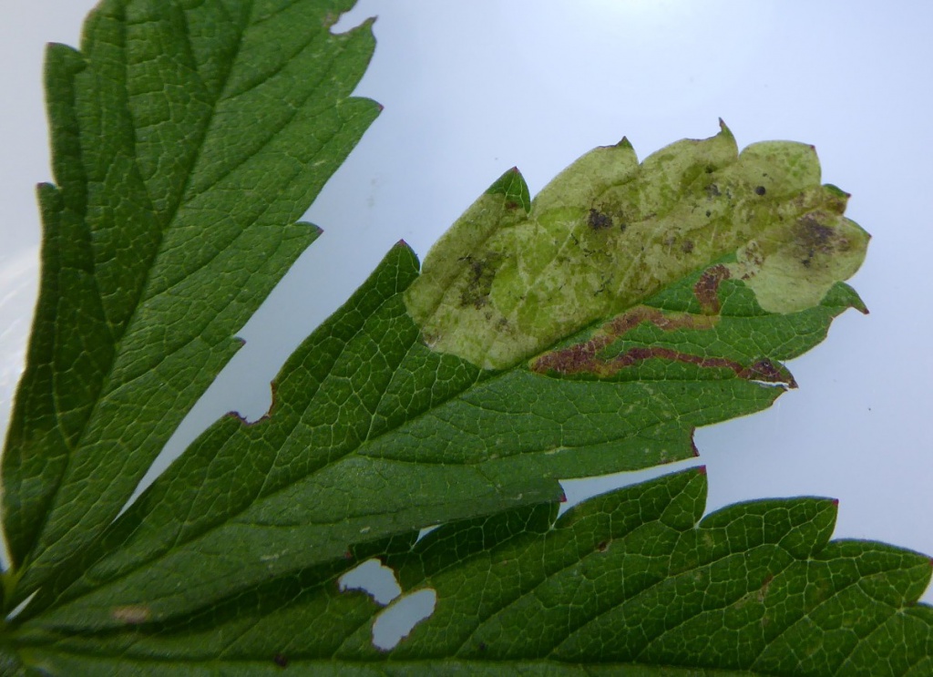 The larva of the Agromyzid fly Agromyza sulfuriceps mines the leaves of various species in the Rosaceae family including Roses, Meadowsweet, Strawberry, Silverweed, Cinquefoil, Raspberry and Burnets. The mine starts as a long corridor, its initial part often along the leaf margin or a thick vein. Rather suddenly the corridor widens into a broad blotch. The corridor contains much frass, often in two distinct patches or lines.