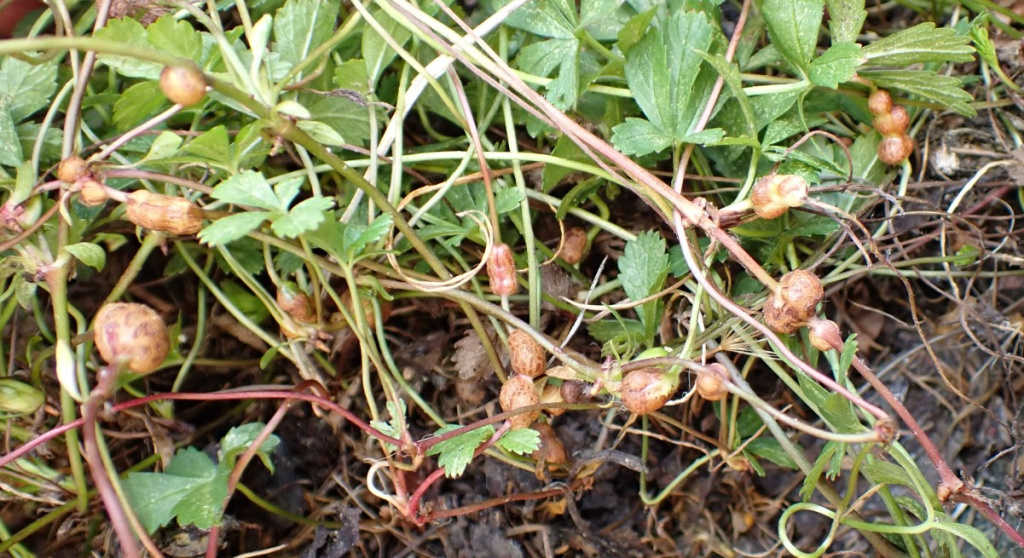The larva of the gall wasp Xestophanes potentillae causes galls on the stem or petioles of Creeping Cinquefoil (Potentillia reptans). The galls can be found very low down close to, or below soil level. Several galls can often been seen on the same shoot, and sometimes fuse together. The galls are a reddish-brown colour when mature.
