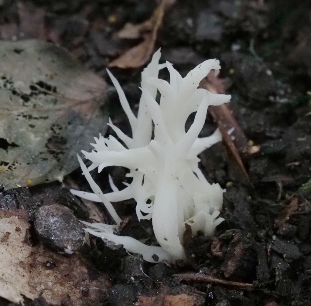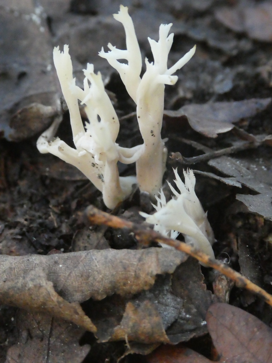 The Grey Coral Clavulina cinerea is usually a darker grey and has rounded blunt branch-tips - but note that Crested Coral may also be greyish or blackish towards the base due to an infection from a microfungus. The Wrinkled Club Clavulina rugosa is chalky white and usually unbranched or only slightly so.