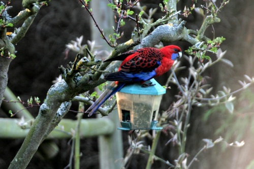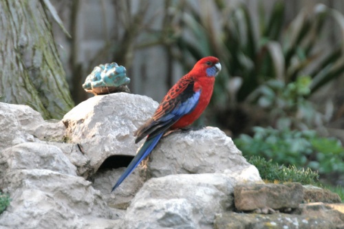 Platycercus elegans is a medium-sized Australian parrot at 36 cm (14 in) long, much of which is tail. There are five subspecies, three of which are actually crimson. All races have blue cheeks and black-scalloped blue-margined wings and predominantly blue tail with predominantly red colouration.