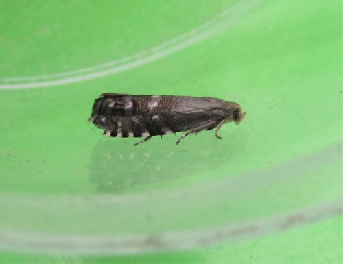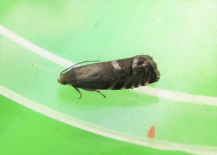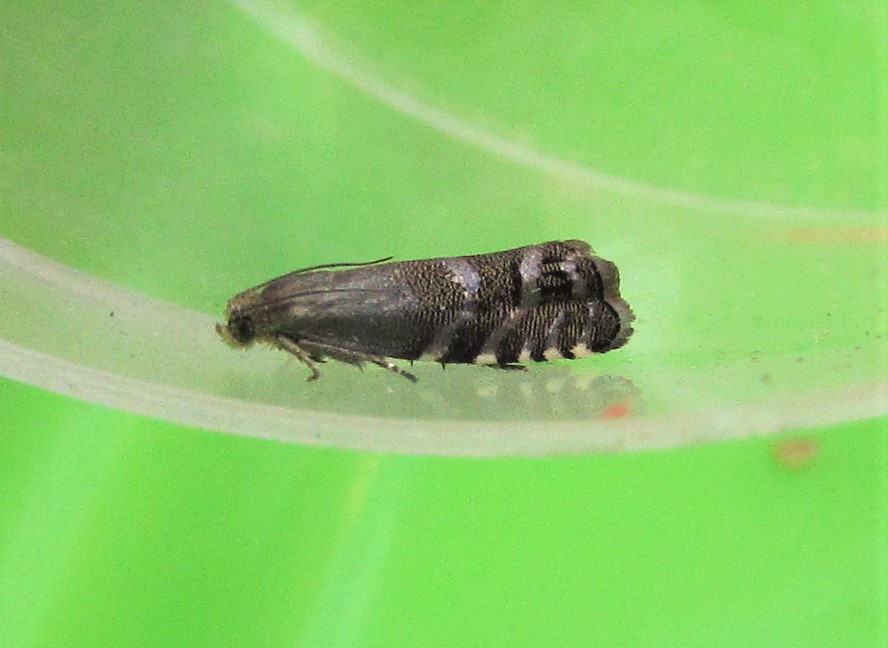 Wingspan about 11mm.  Sometimes a small exit hole in a pine cone can be observed and indicates that the larva has overwintered in it and the adult moth has emerged.