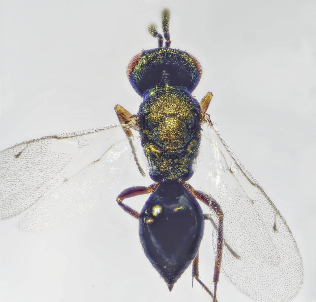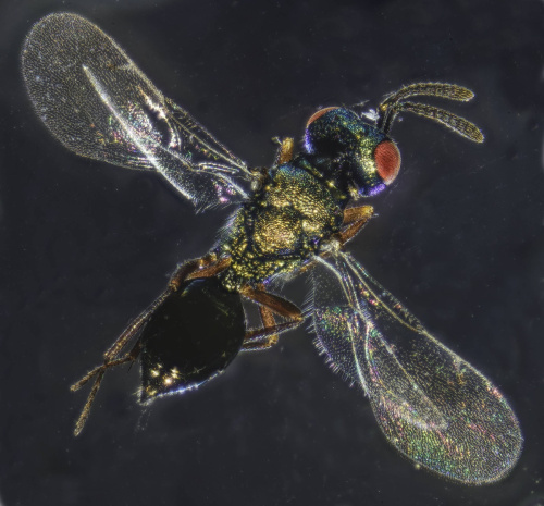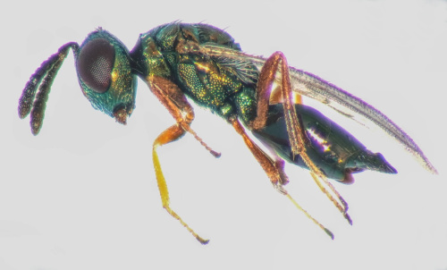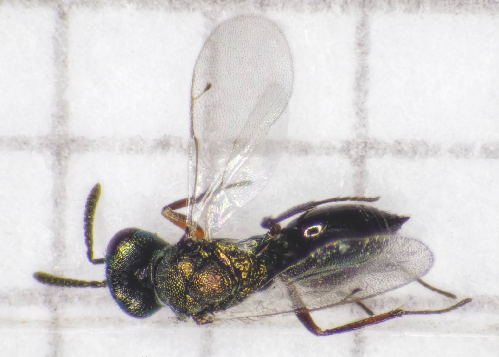 2-3mm long metallic green-bronze-green wasp. Like most Pteromalids, they have elbowed (geniculate) antennae with a 13-segmented structure (including the tiny ring segments). The clypeus (the area above the mouthparts) usually has a distinct, slightly emarginated (notched) front edge.