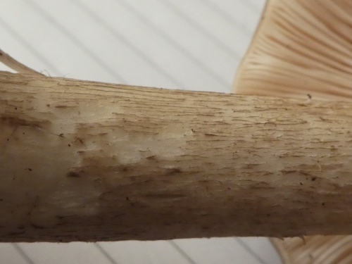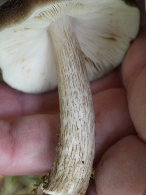 The cap is brown with darker radial lines, bell shaped when young and more convex later with a blunt umbo. The stipe is quite long and is usually thicker at the base. It is covered with brown vertical fibrils on a white ground. The gills are white, becoming pale pinkish-brown.