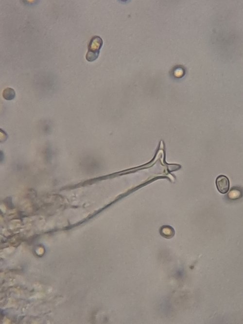The cystidia on the gill edges stick out further than the basidia and have short projections at the tip, like horns. These can be seen at x400 magnification - put a small piece of gill on a slide with a drop of water, and squash under a cover-slip.