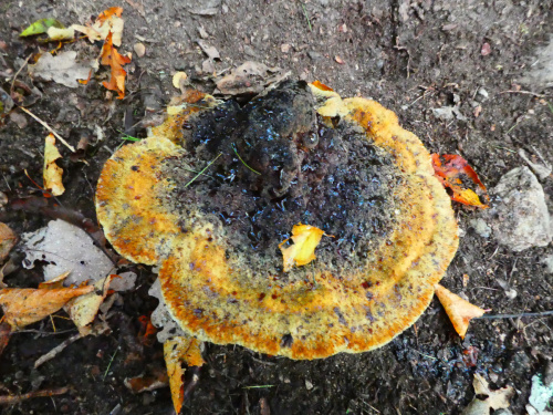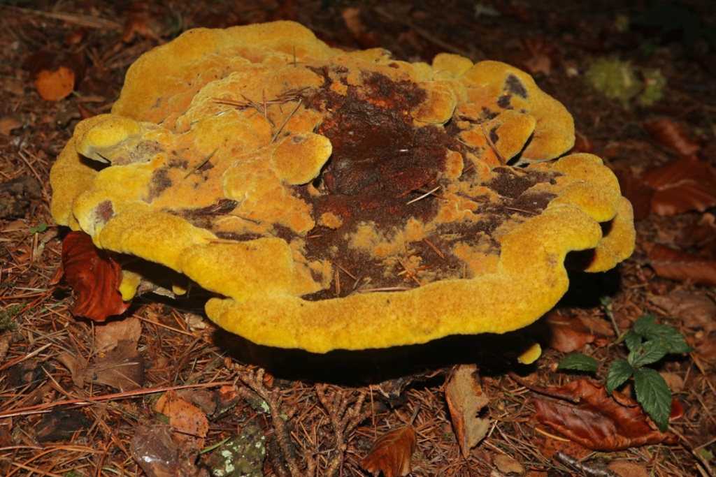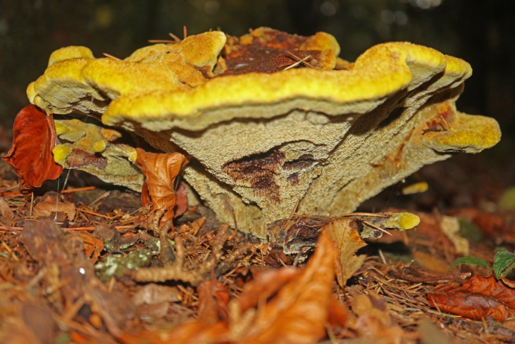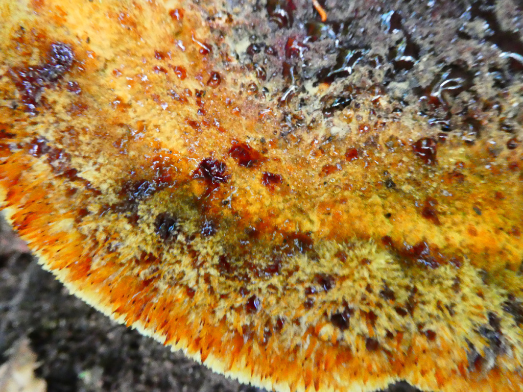 A large annualclustered bracket with smaller caps arising form a common stem. Caps are soft, spongy and fleshy, rusty brown and felted, with a bright yellow margin when actively growing. The caps harden as they mature specimens, with a darker central zone. Pores are labyrinthine, grey-green and coarse at 1 - 2 per mm.