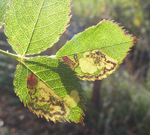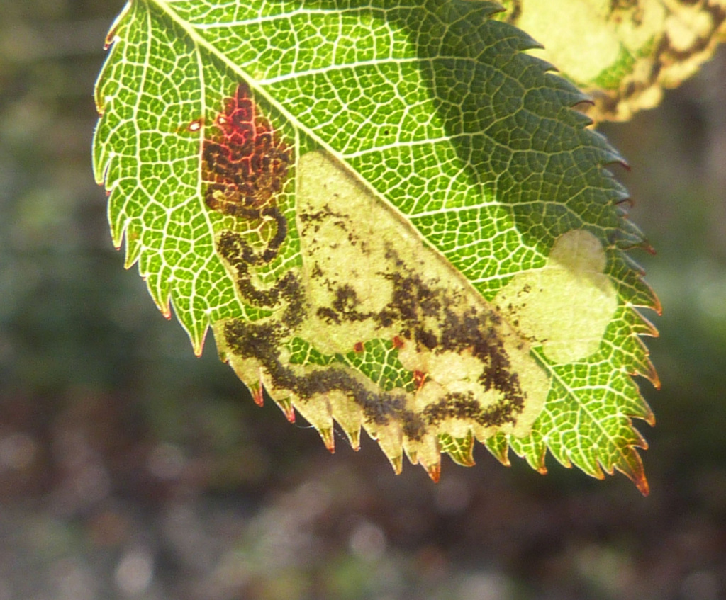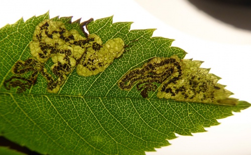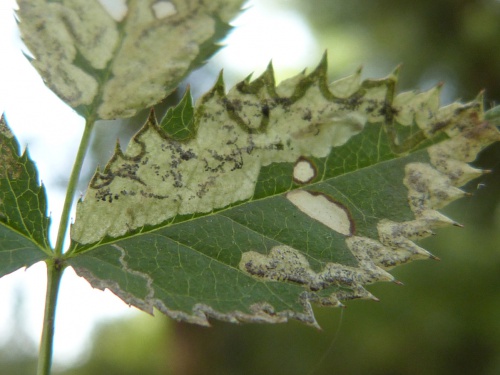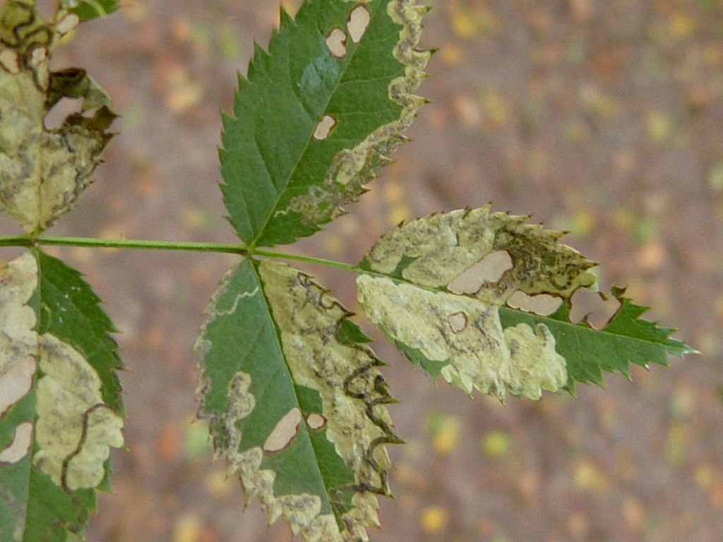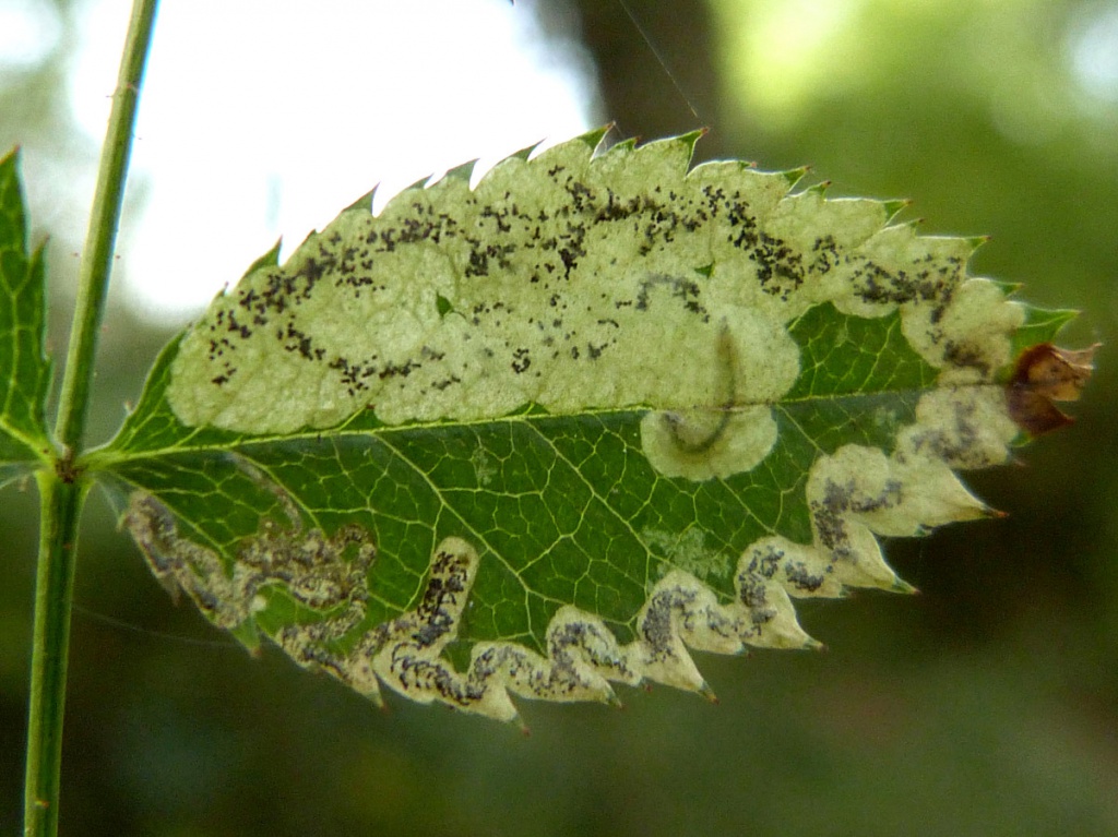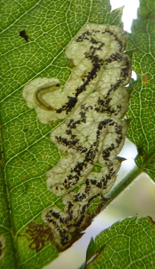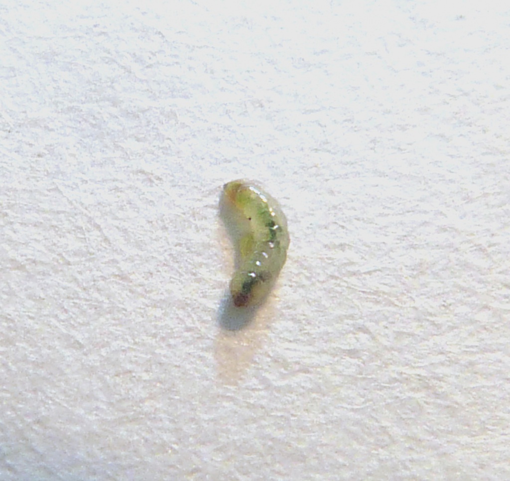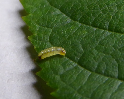 The larva creates a mine in a Rose (Rosa) leaf, beginning as a contorted gallery filled with brownish frass and then widening into a blotch with central or dispersed blackish frass. The young larva itself has a chain of dark spots on the abdomen. In later instars, these spots become smaller and less noticeable, and the green gut can be seen.