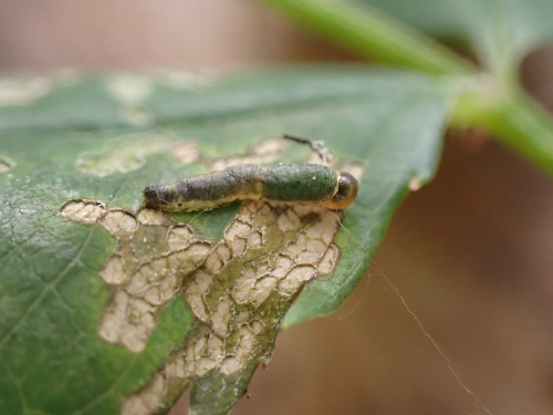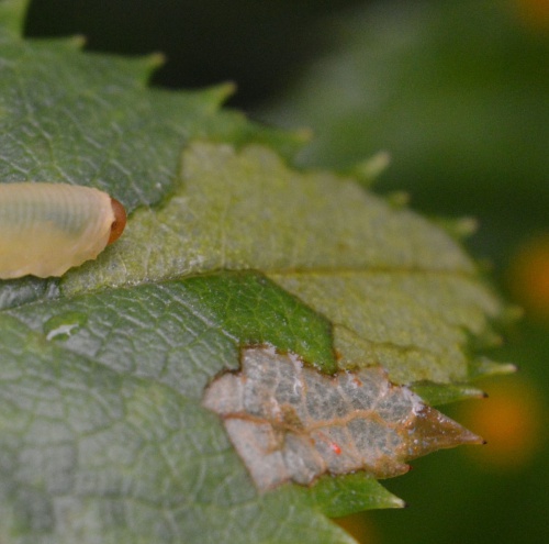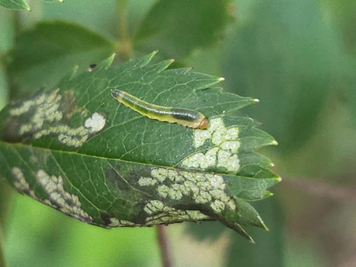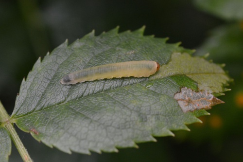 Sometimes known as the Rose slug sawfly, the larvae has a transparent yellow-green body and orangey-brown head