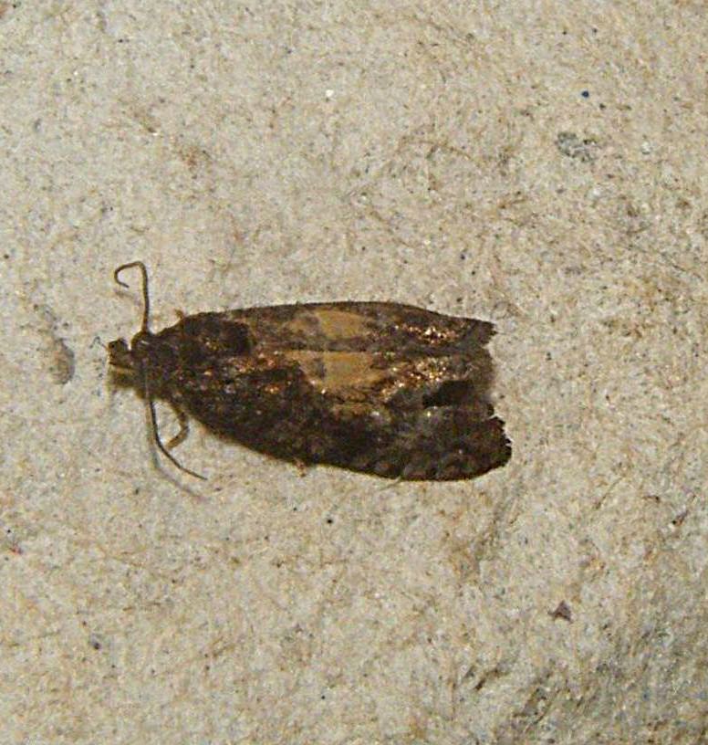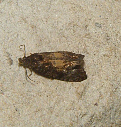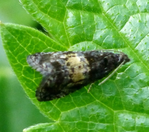 Wingspan about 13mm. The adults are quite distinctive, typically with a yellow or ochreous blotch on the dorsum, although this can be less obvious on darker examples.