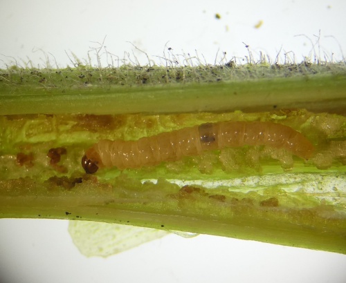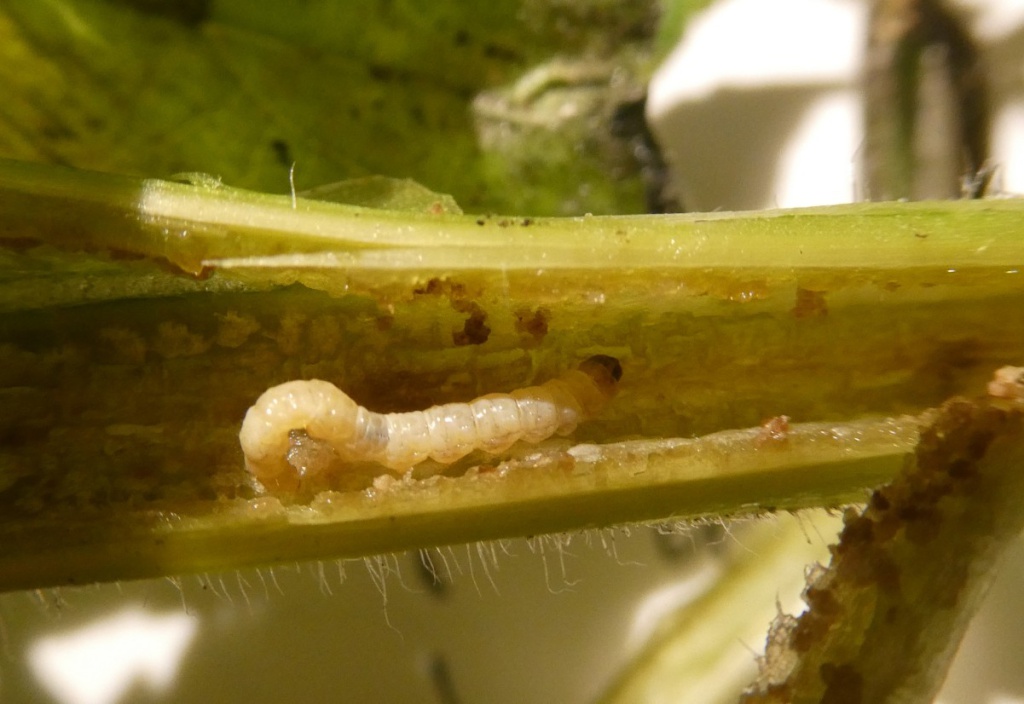 The larvae feed on Marsh Woundwort (Stachys palustris), eating down from the flower into the stem and roots.