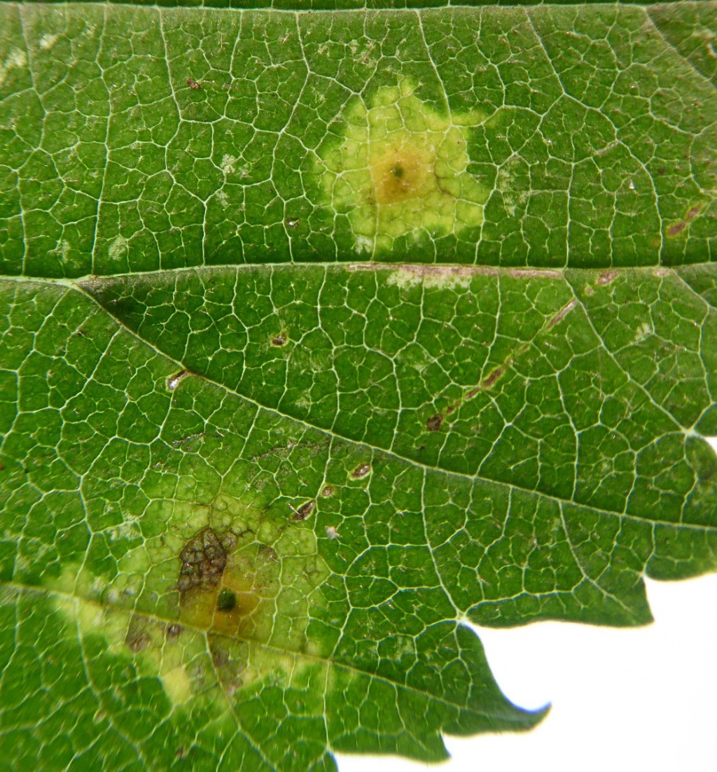 The larvae of the Zig-zag Elm Sawfly (Aproceros leucopoda) feed on the leaves of Elm, prodicing characteristic zig-zag cut-out patterns in the leaf.