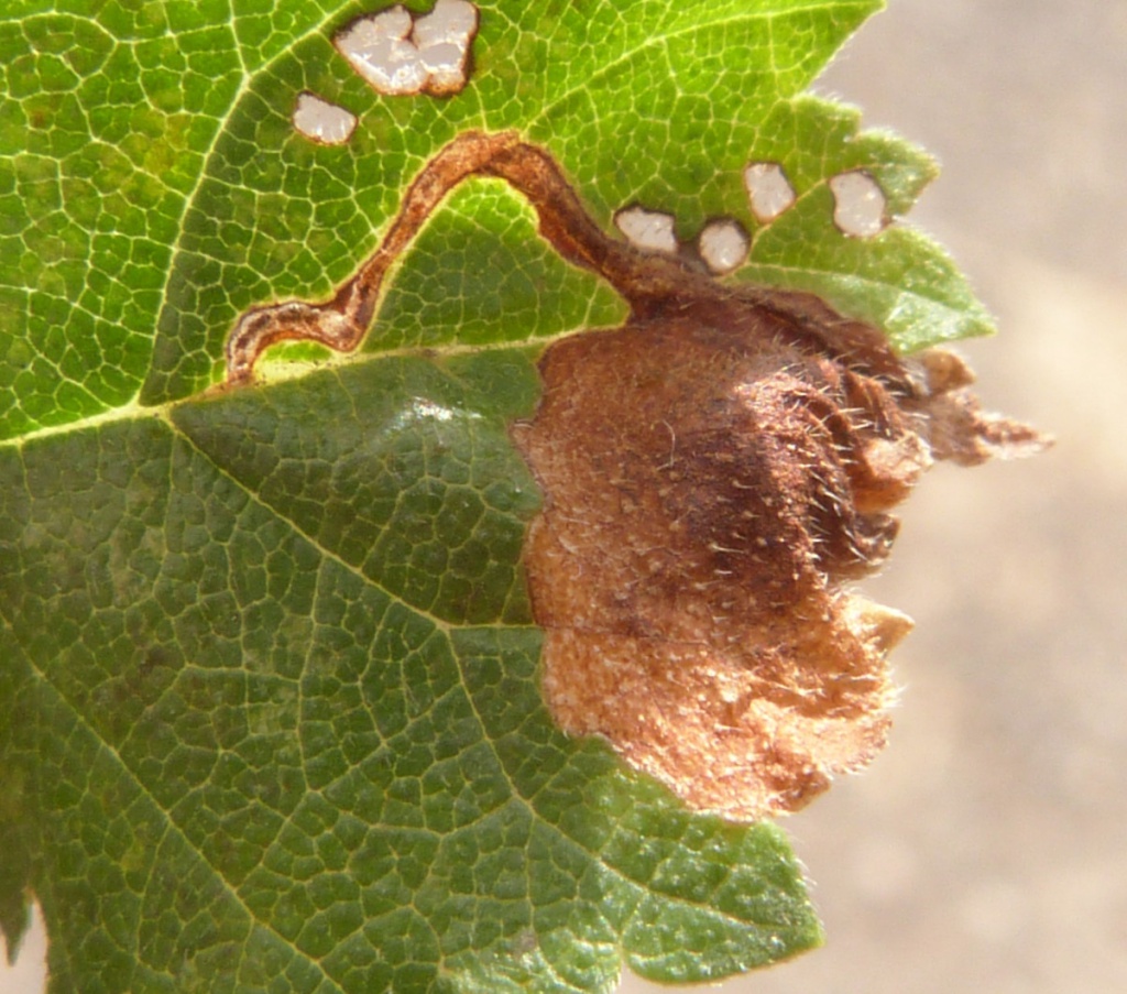 Eriosoma ulmi is a greyish waxy aphid that causes a leaf roll gall to form on the leaves of Elm. One half of the Elm leaf blade crinkles and rolls in to form a tubular pouch. The gall is seen more often than the aphid.