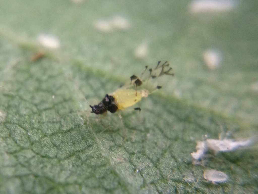 All adult of the aphid Tinocallis takachihoensis viviparae are winged. These alates are pale yellow-green with a shiny black head and thorax. The pattern of black markings on the wings is diagnostic.