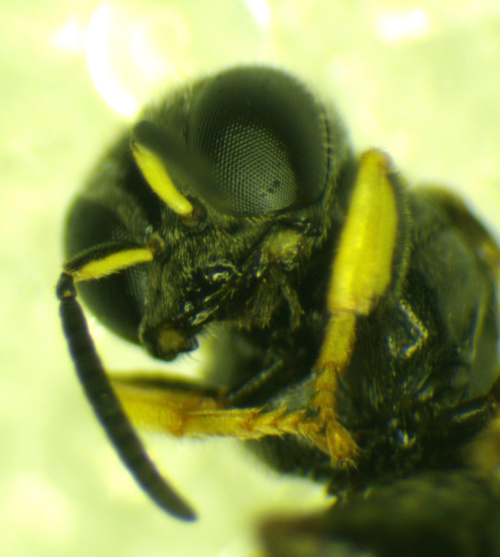 A small, black wasp superficially resembling Lindenius species, but with pronounced hairy eyes.