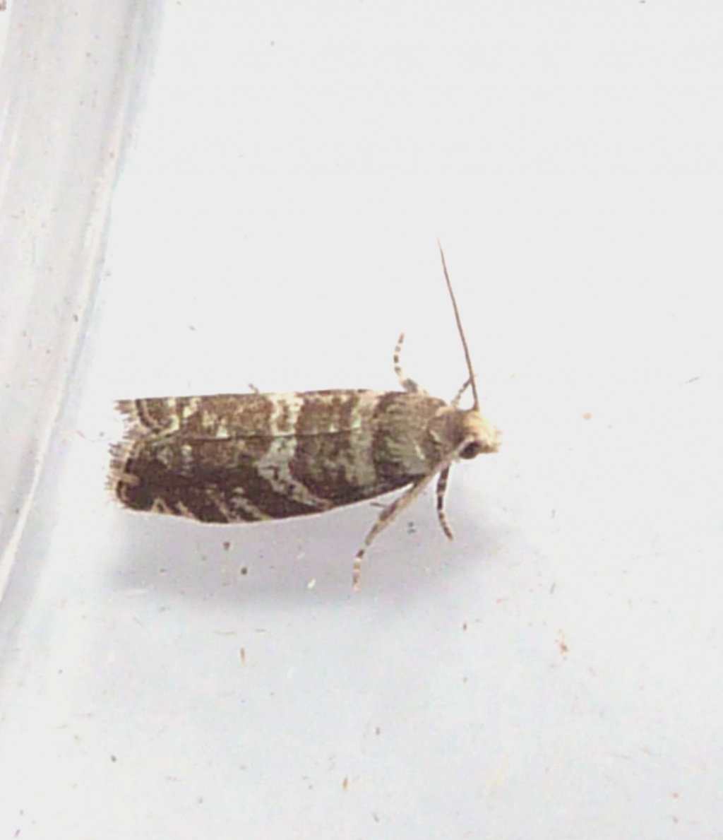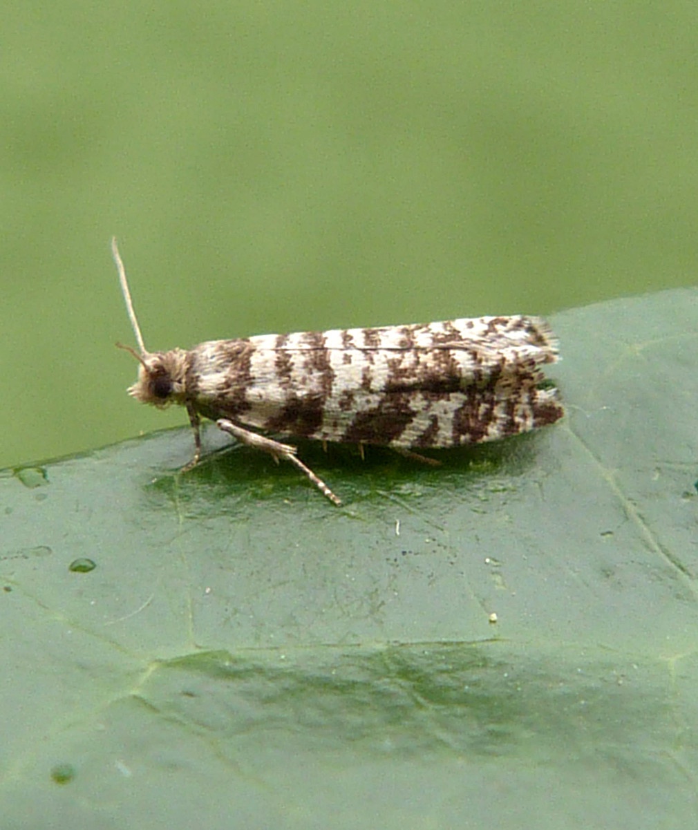 Wingspan 10 to 13 mm. An attractively-marked species with noticeably pale labial palps.