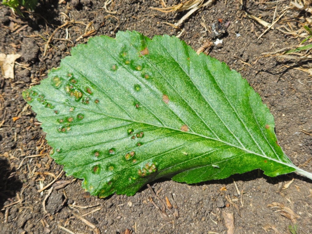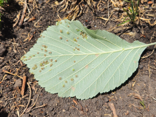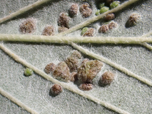 The midge Eriophyes arianus causes galls to form on the leaves of Sorbus aria. The galls take the form of slightly rounded pustules raised on both surfaces of the leaf, up to 2 mm across, sometimes coalescing, and with the opening on either the upper or lower leaf surface. The galls are light green or yellowish at first becoming brown later. It should be added that that taxonomy of the gall mites that cause this type of galls on the genus Sorbus is not yet fully stabilised.