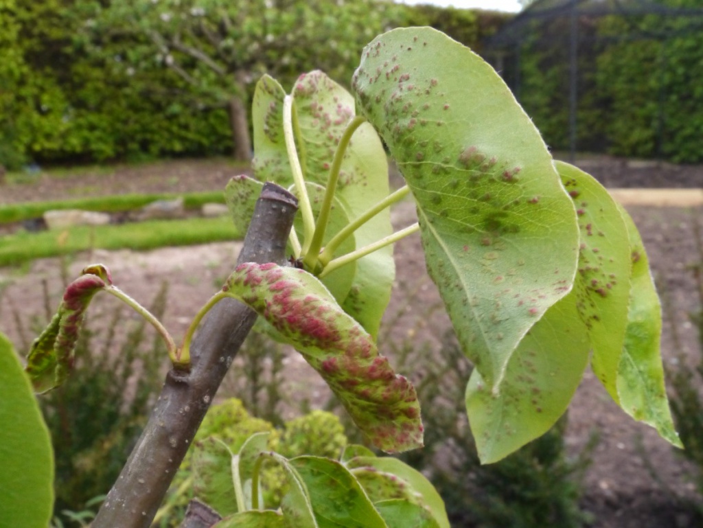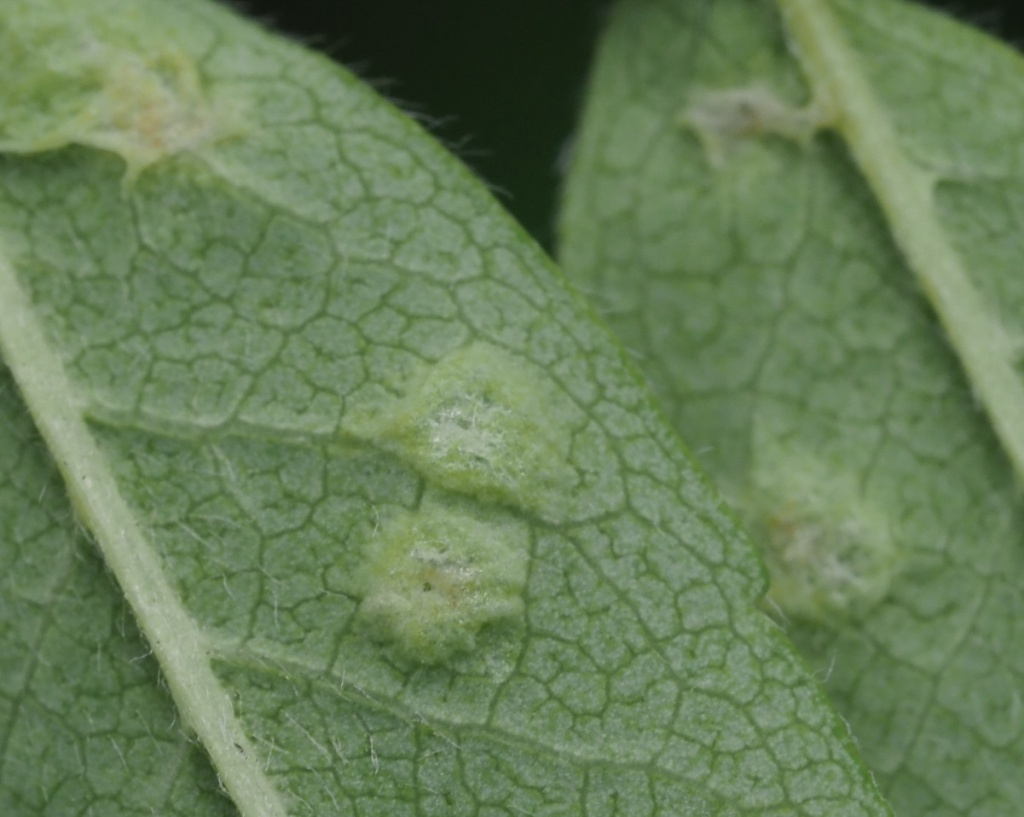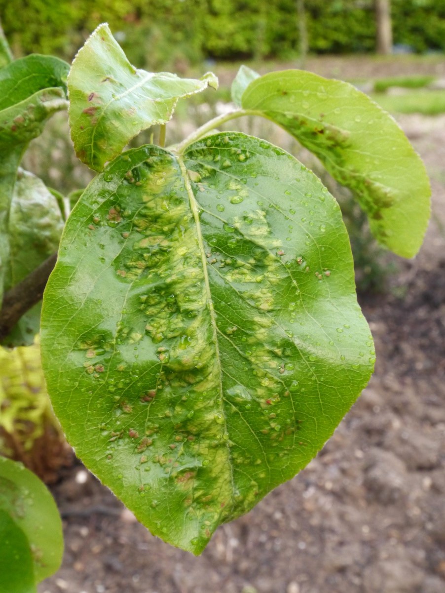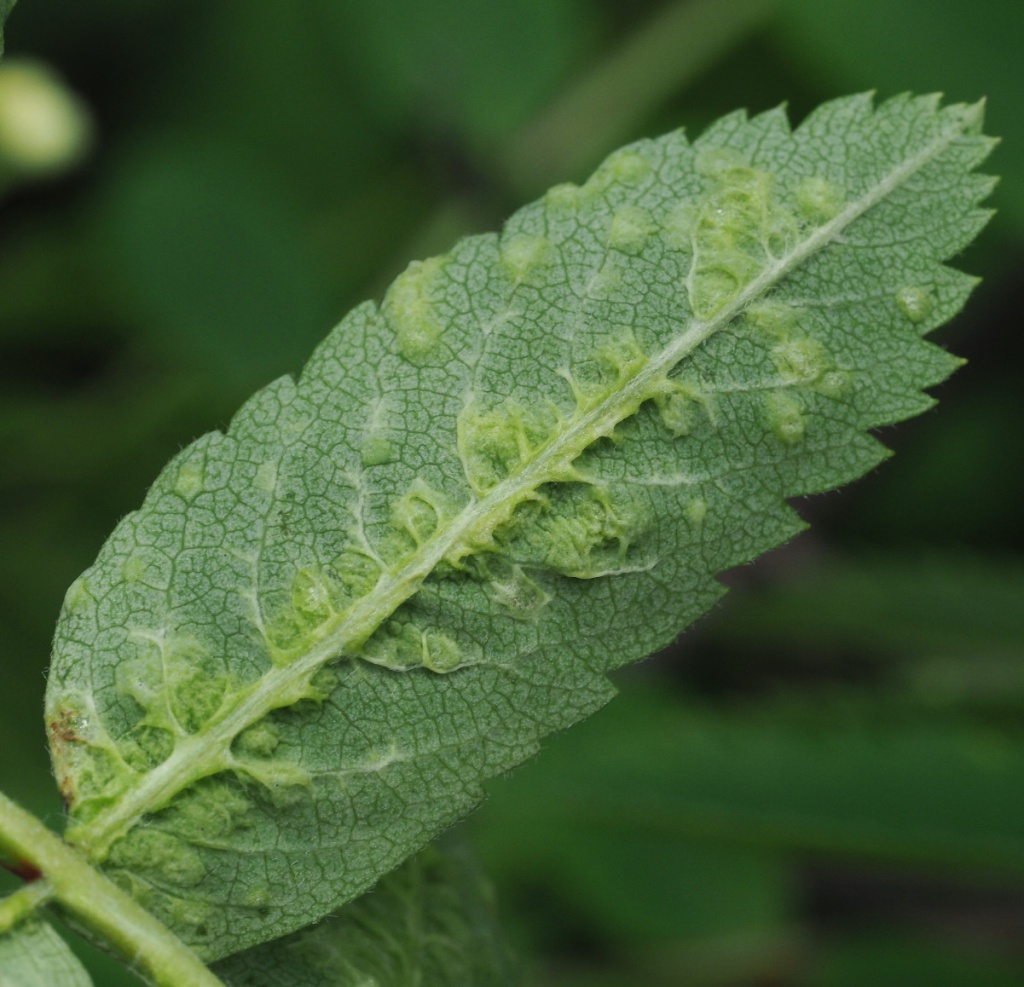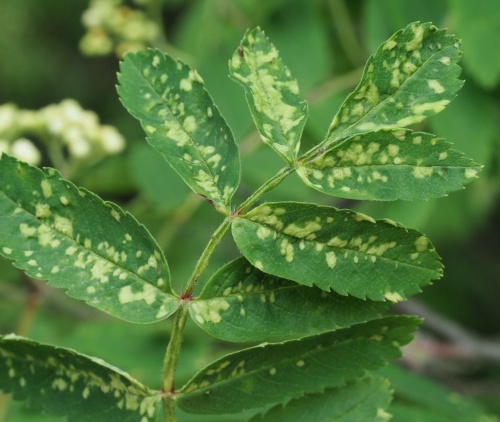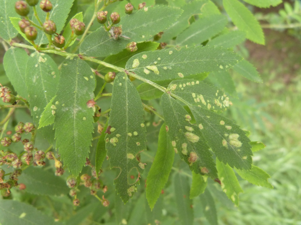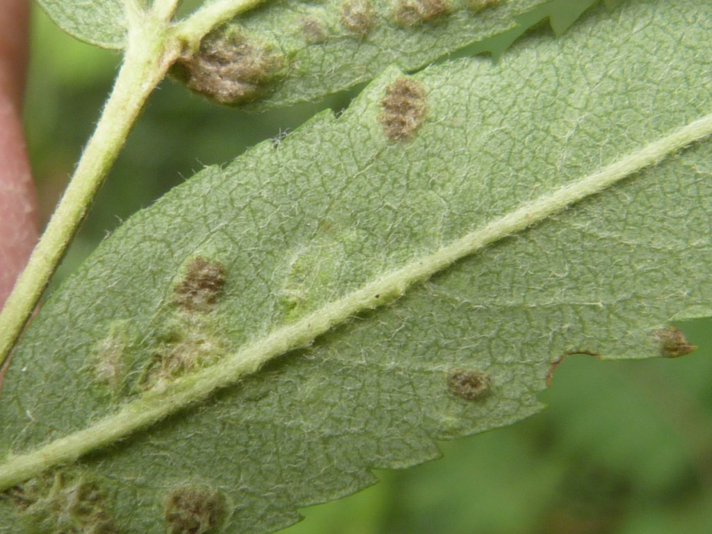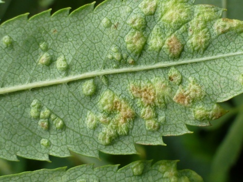 Eriophyes pyri is a tiny mite that causes galls to form on the leaves of Rowan and Pear, and some other members of the rose family. The mite causes domed pustules with openings, on both leaf surfaces - green/yellow at first but turning brown.
