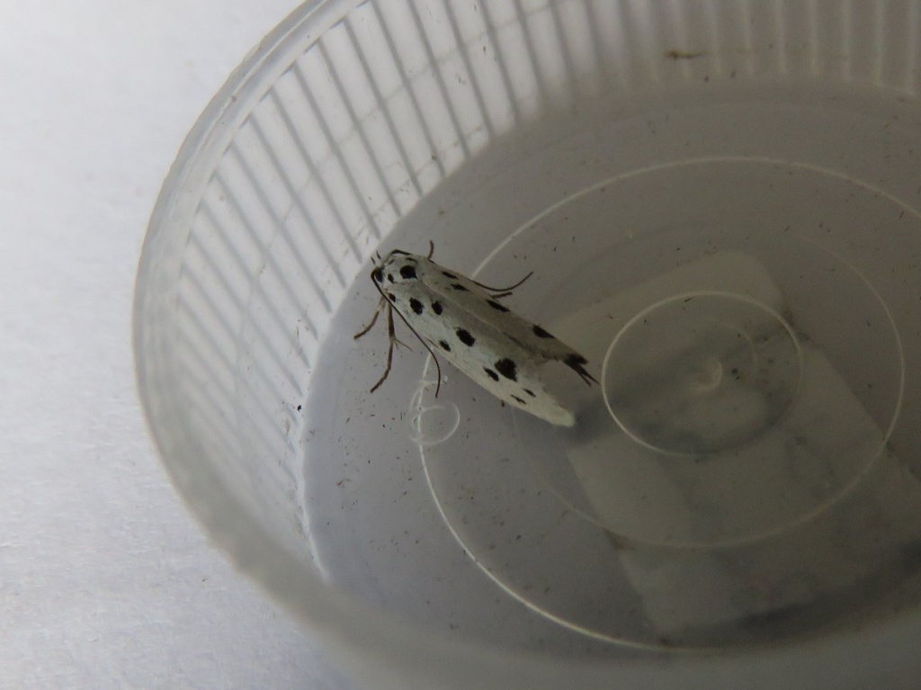 Wingspan 17 to 21 mm. This striking species bears a superficial resemblance to the 'Ermines' (Yponomeuta spp.), but the black dots are larger and fewer.