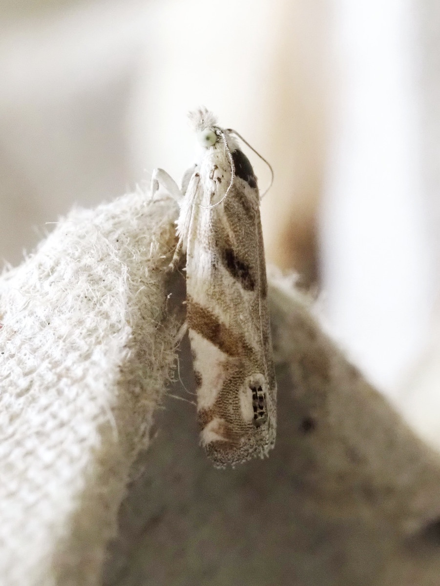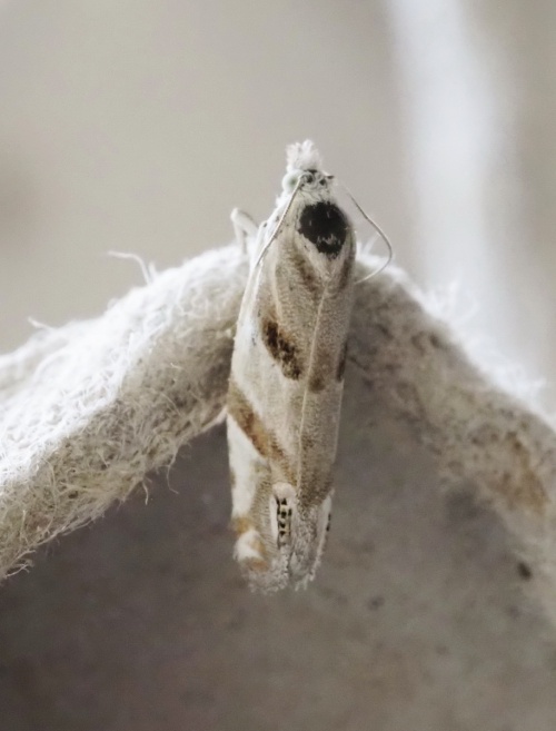 Wingspan around 17 mm. This species has a distinctive wing pattern of brown bars on a pale background.