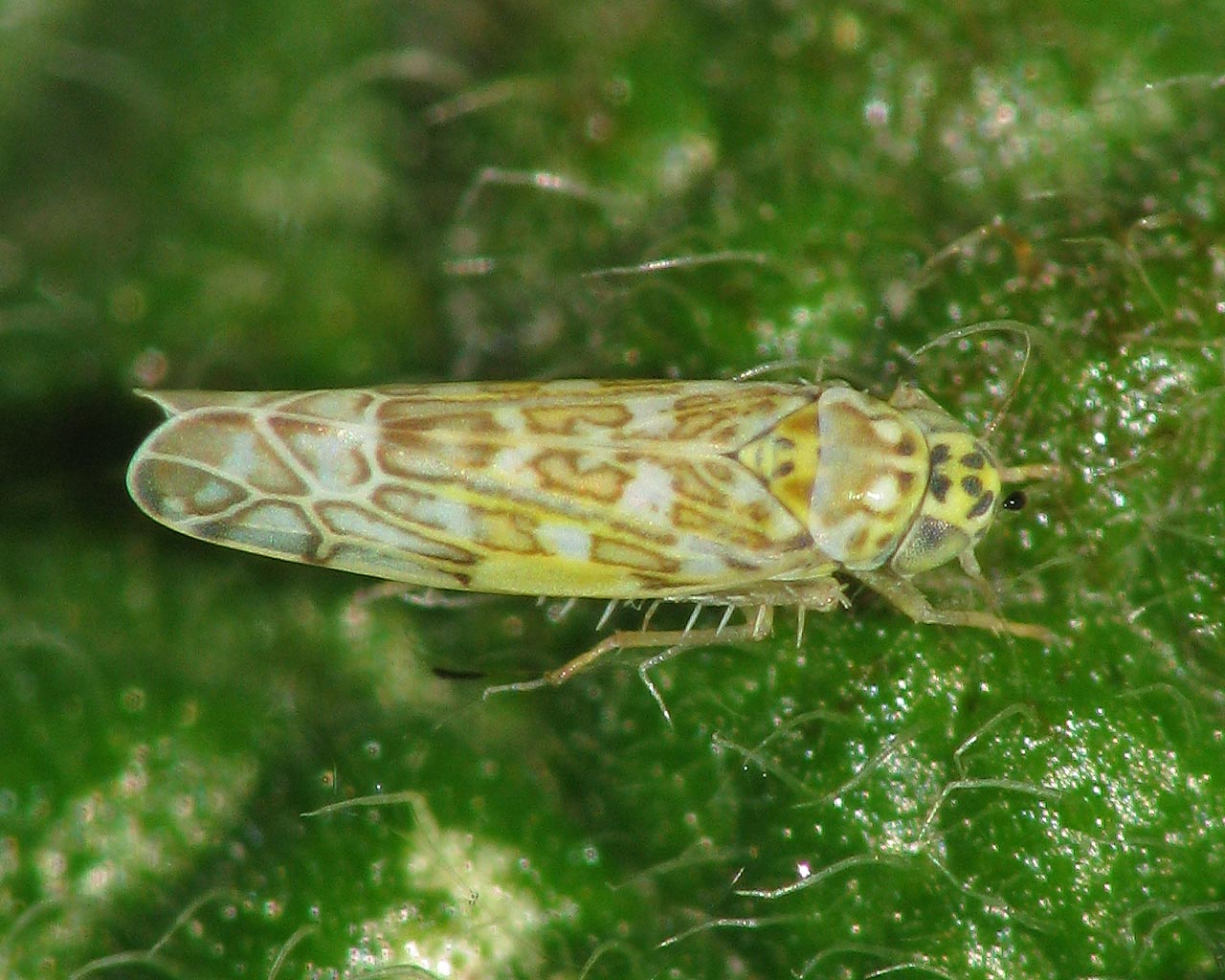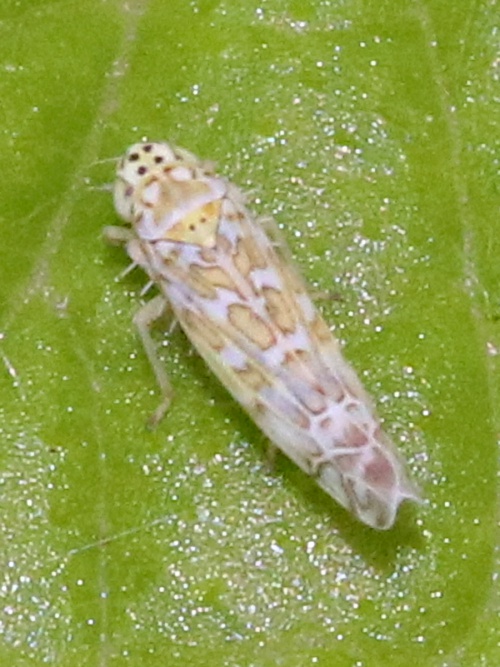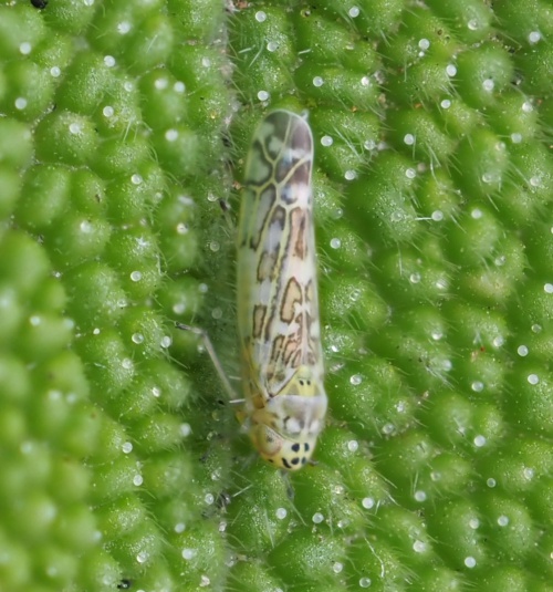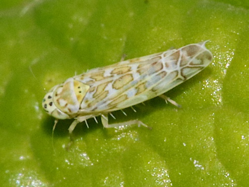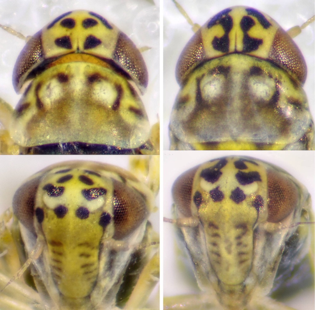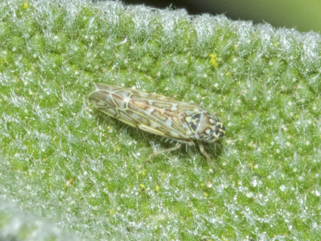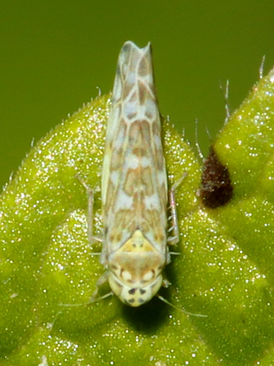 Eupteryx melissae, also on Sage, is slightly larger and has fewer spots on vertex and face.