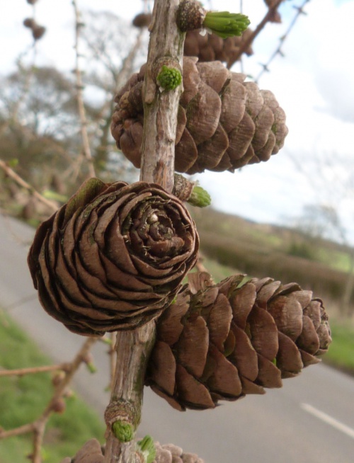 Sometimes it is very difficult to identify material, but the tall cones, erect scales and shorter leaves of L. decidua are good characters. The hybrid can be very difficult to separate from the species.