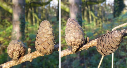 L. x marschlinsii - pink-orange-brownish twigs with leaves 40 to 50 mm long and mid-height ovoid cones.