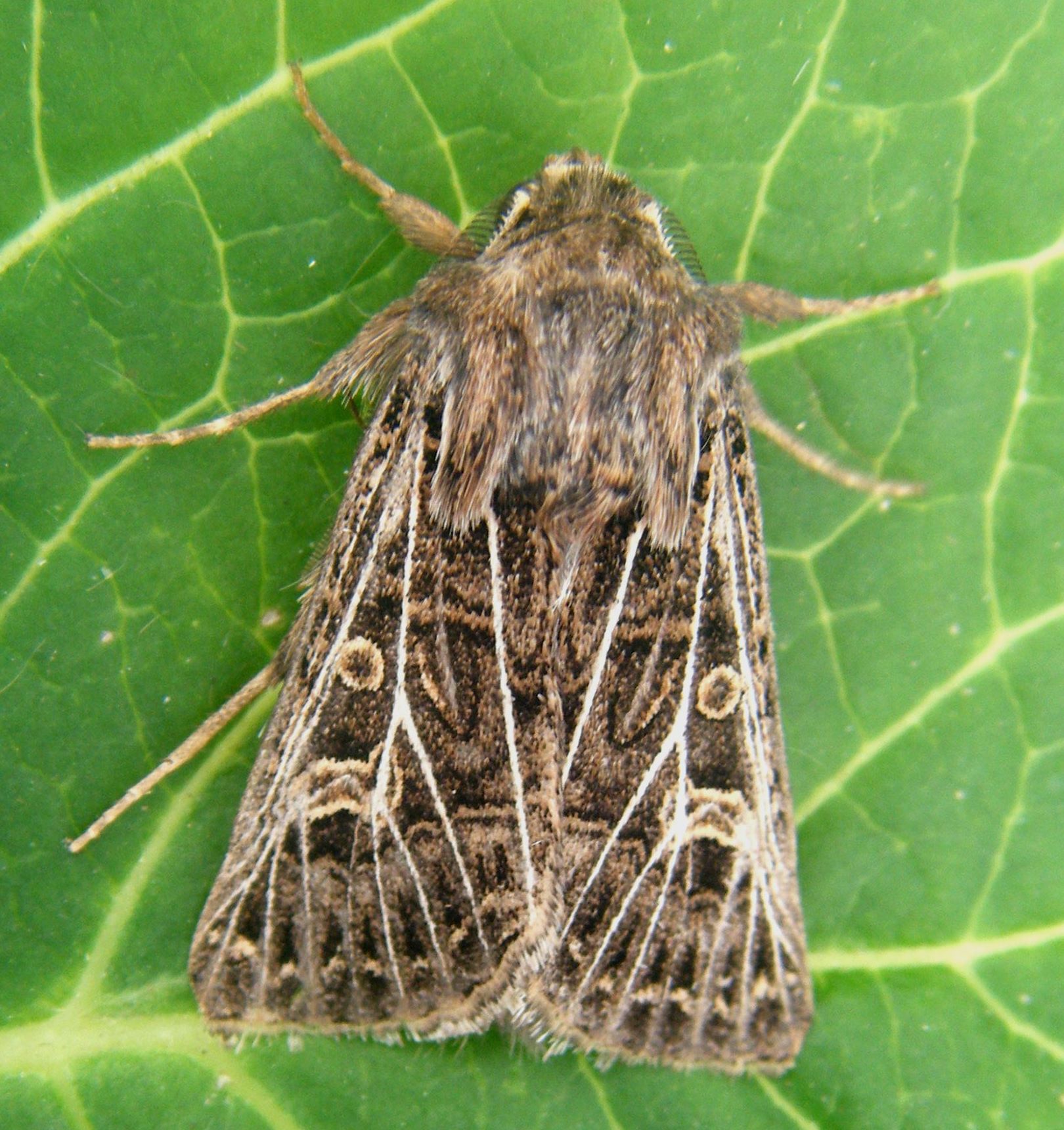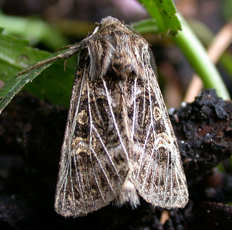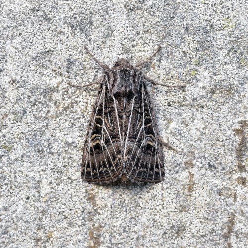 Wingspan 32-45 mm. A variable, often grey-brown moth well marked with lines and other marks.