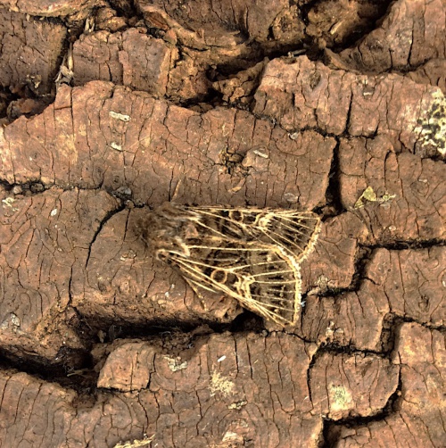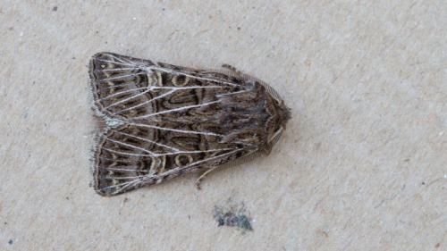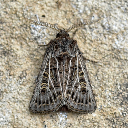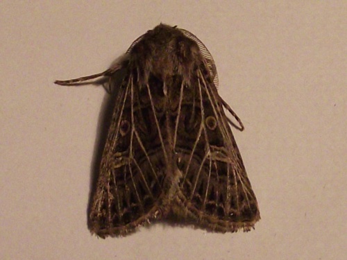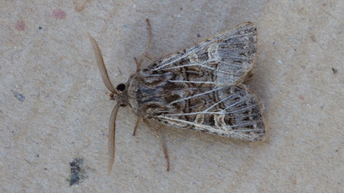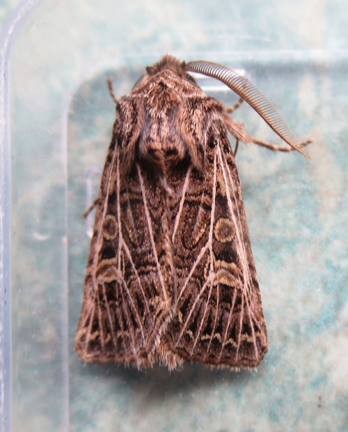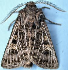 The adults are on the wing in August and September, when the males in particular are attracted to light.