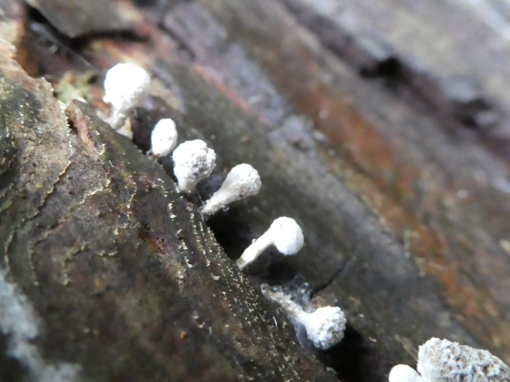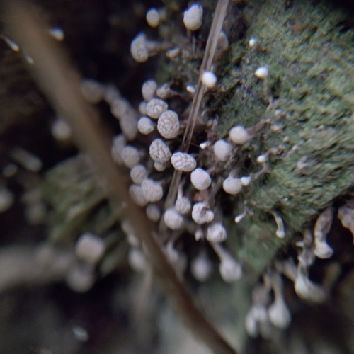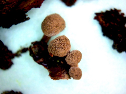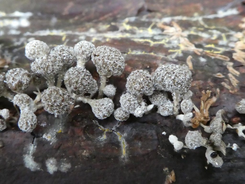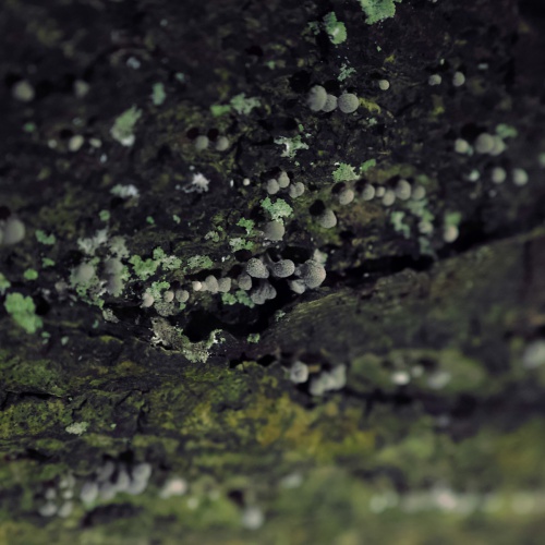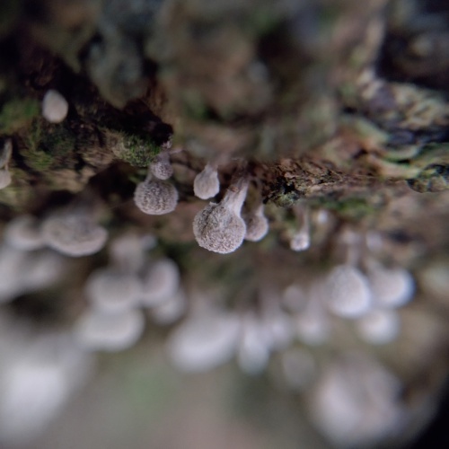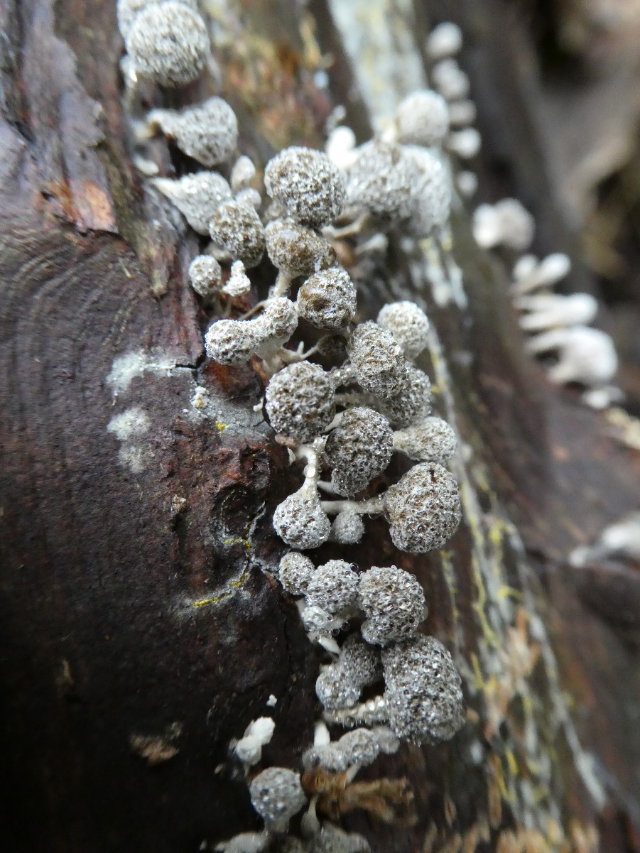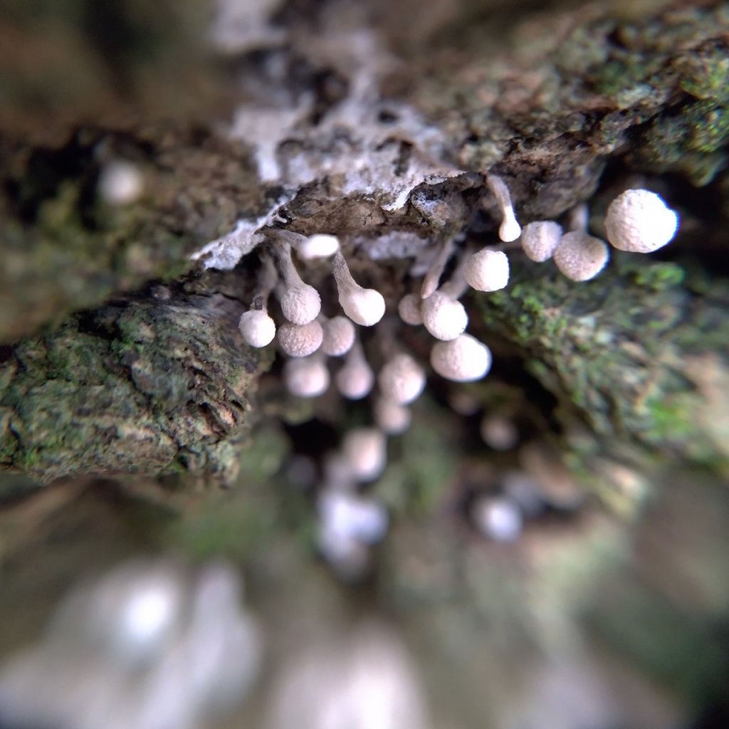 The small tough fruitbodies occur in clusters on the bark of deciduous trees, especially beech. The head is ball-shaped, 1 to 3 mm across, and is intially greyish white, becoming dark grey or brownish with age.