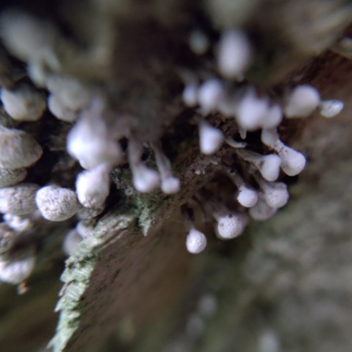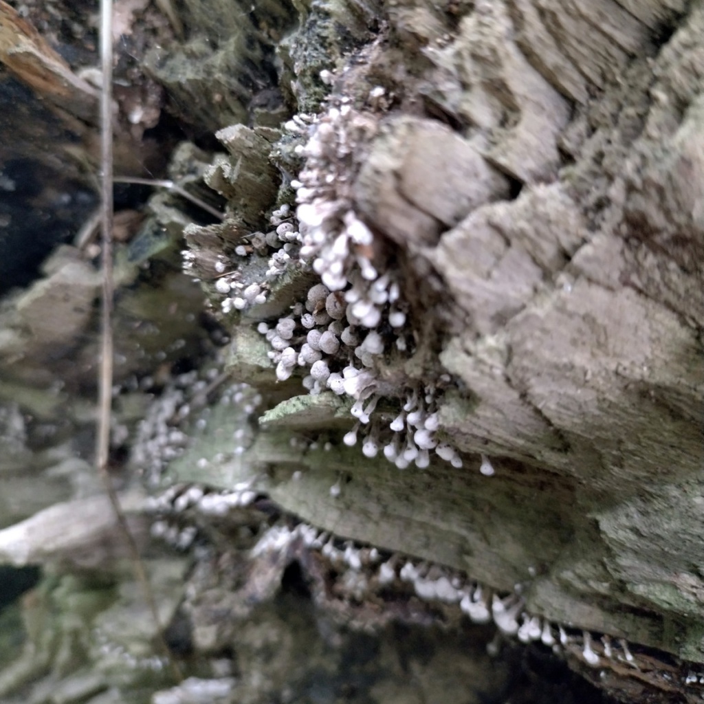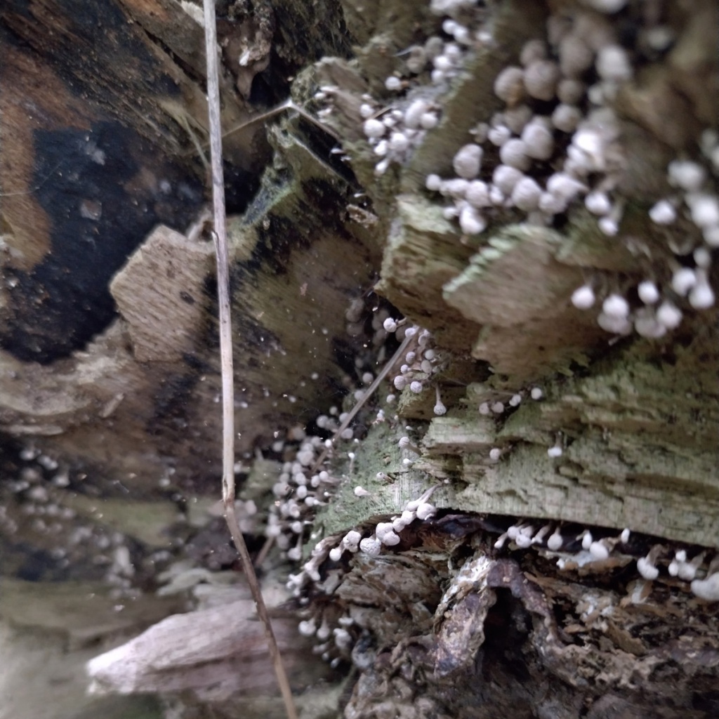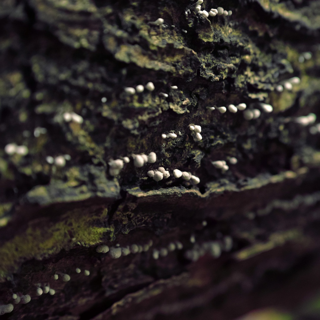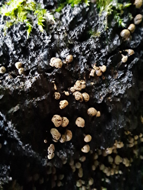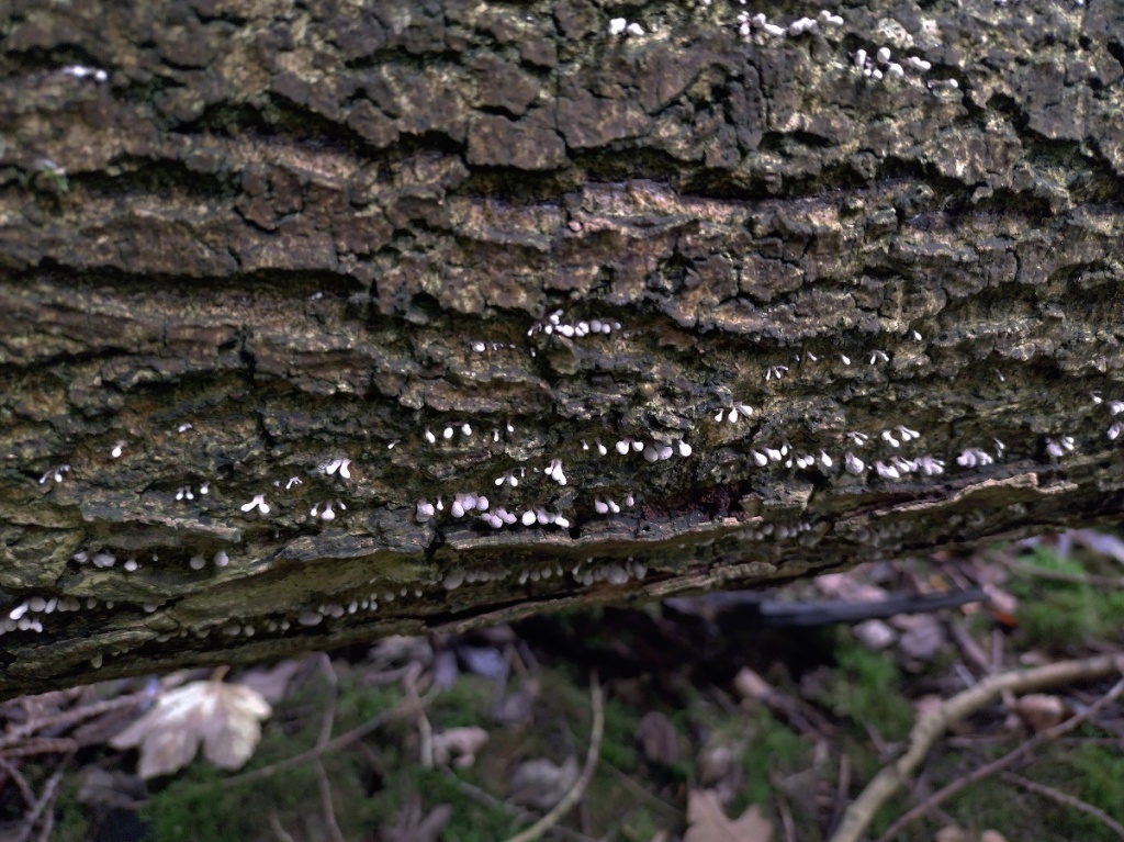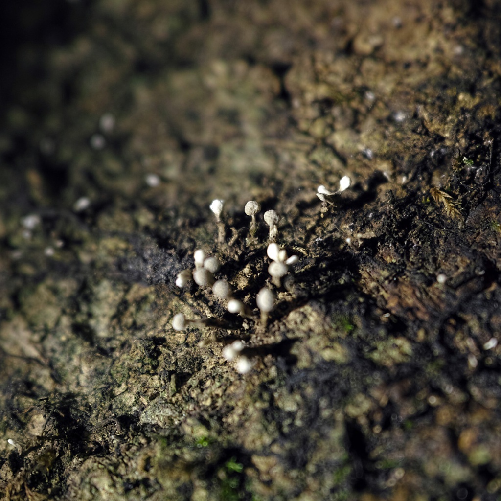 The small tough fruitbodies occur in clusters on the bark of deciduous trees, especially beech. The head is ball-shaped, 1 to 3 mm across, and is intially greyish white, becoming dark grey or brownish with age.