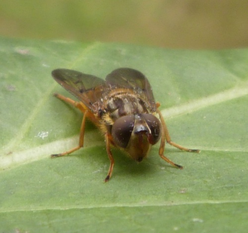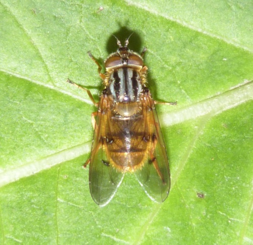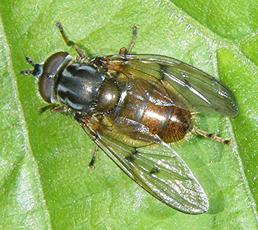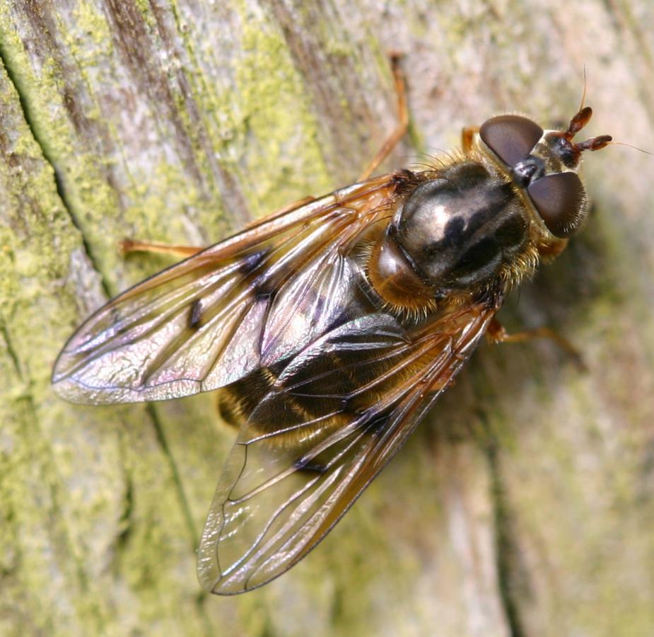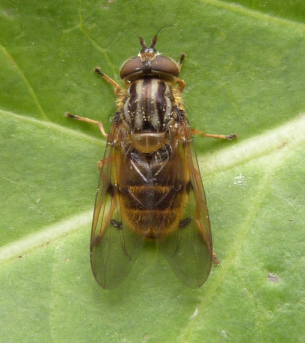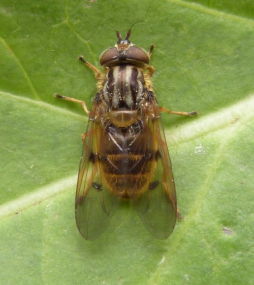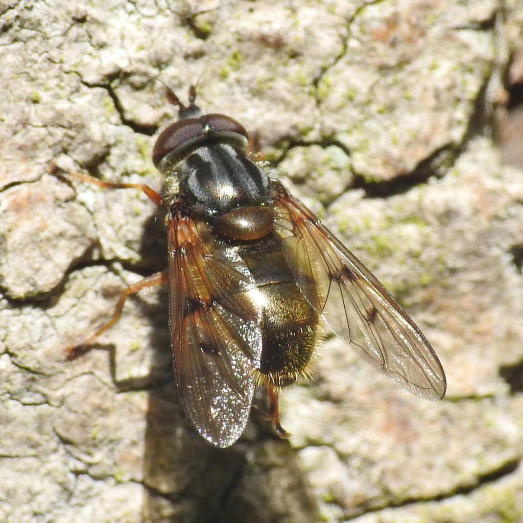 This species is relatively easy to identify with its often brassy looking abdomen, the grey stripes on its thorax and the two wing 'clouds' (dark marks).