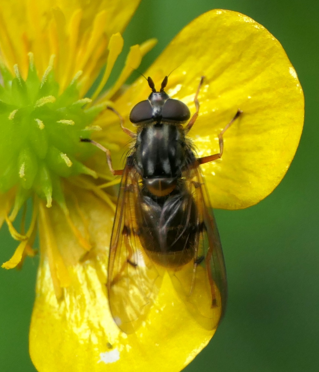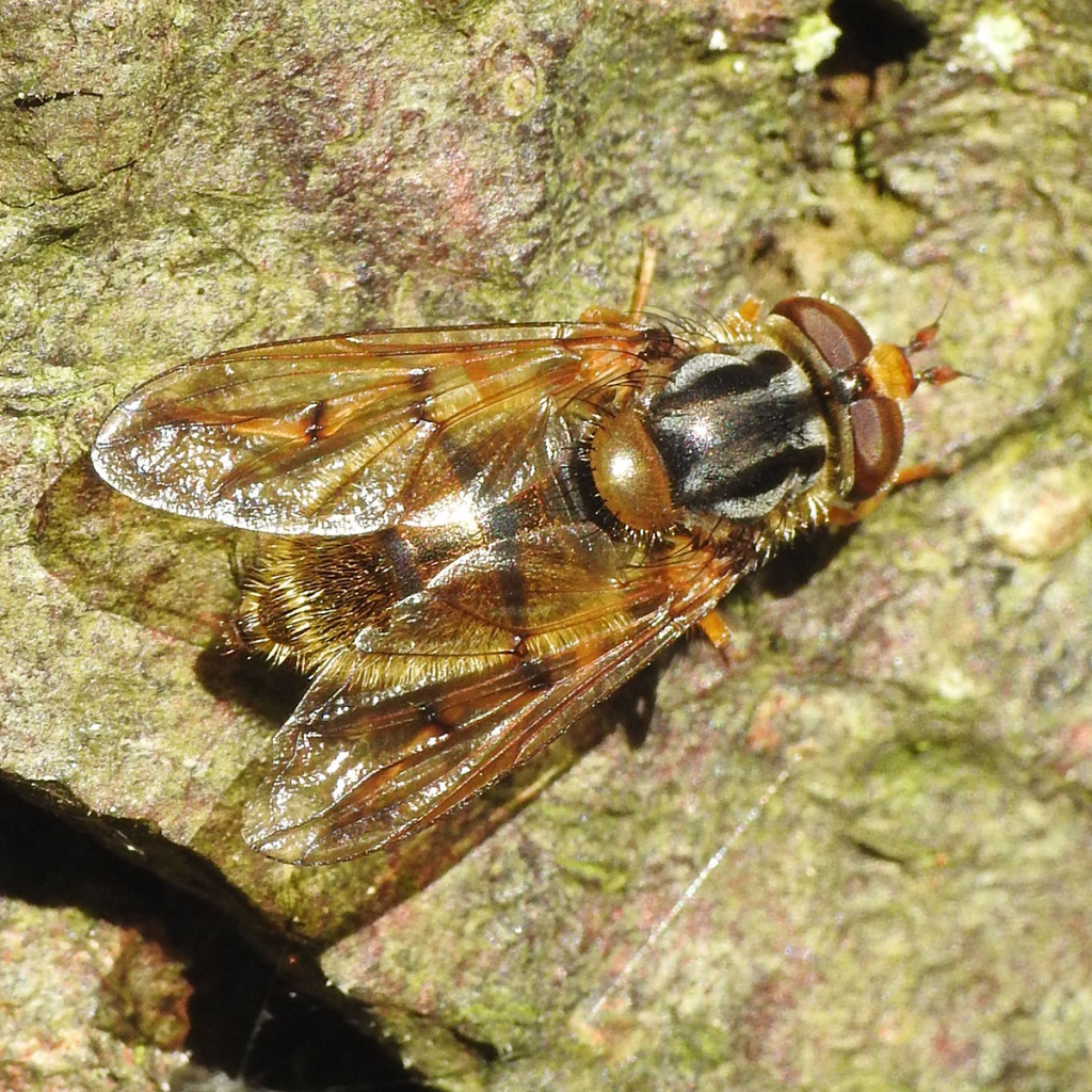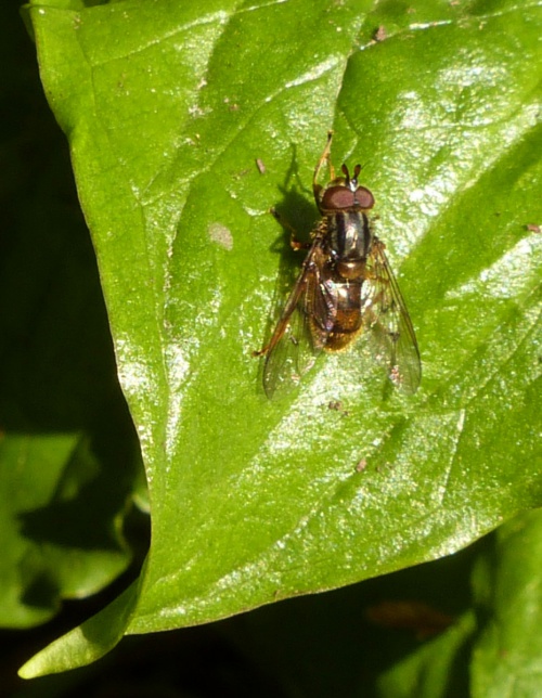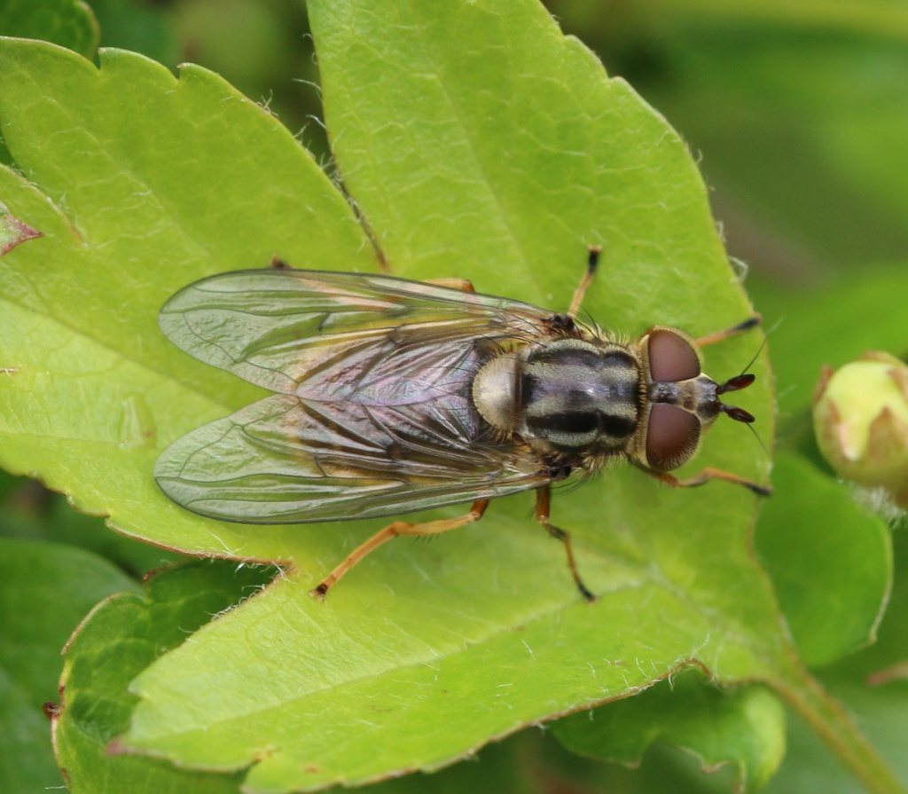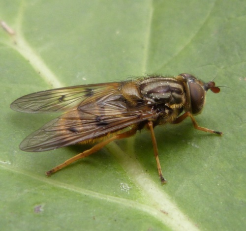 This species is relatively easy to identify with its often brassy looking abdomen, the grey stripes on its thorax and the two wing 'clouds' (dark marks).