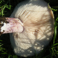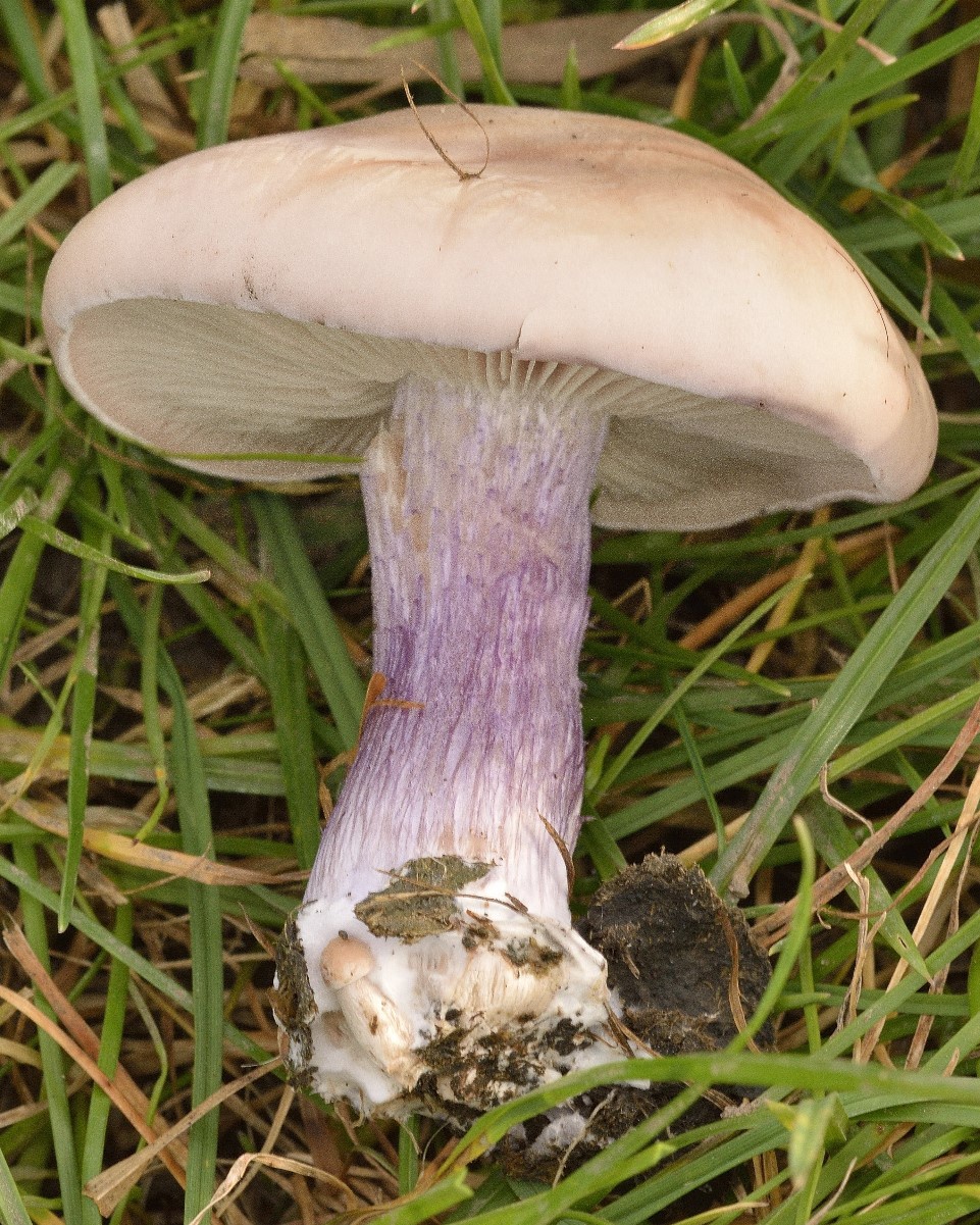 A large fleshy fungus; cap smooth, initially convex then flattened; cap grey-white to beige or grey brown in colour (never violet). Gills pale, pinkish. The stipe is robust, fibrous and flushed with violet on the lower part.