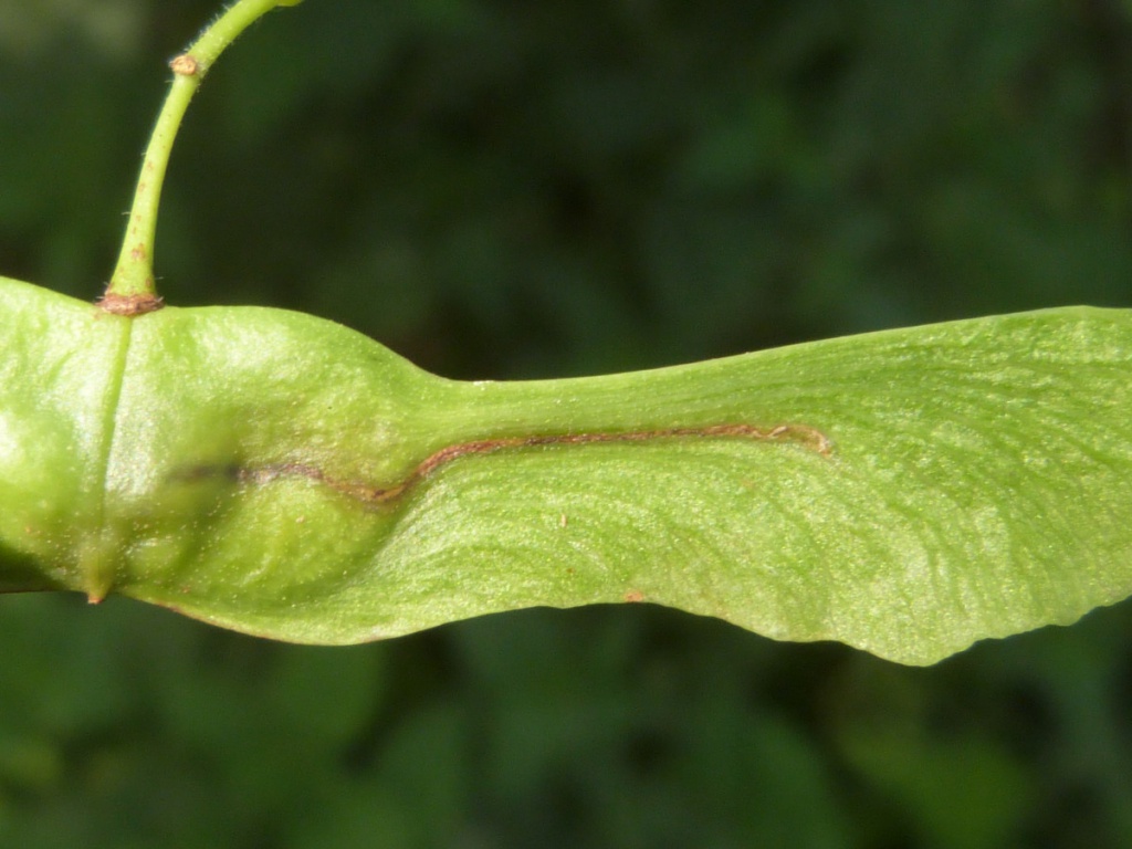 The larva of the moth Etainia louisella mines in the seeds (samaras or 'keys') of Field Maple forming an irregular gallery commencing in the wing and concluding in the seed itself.