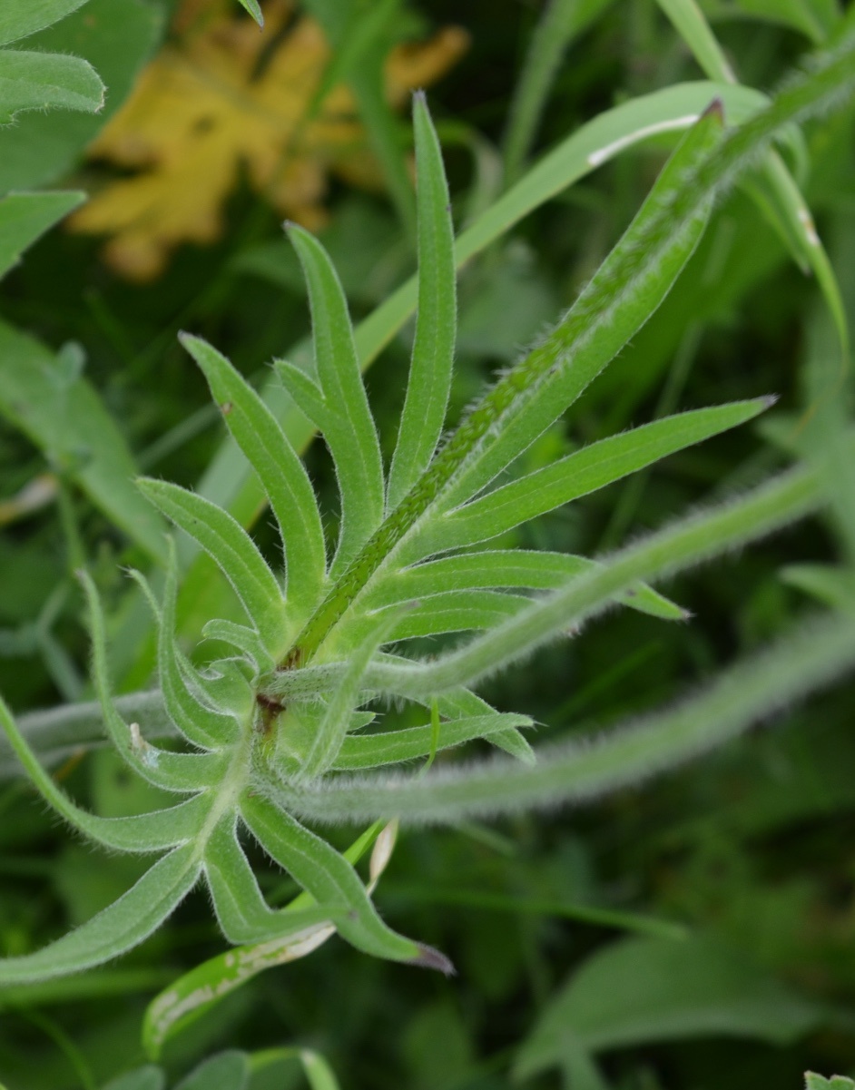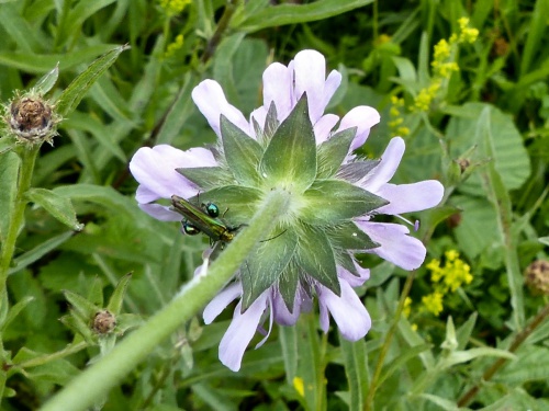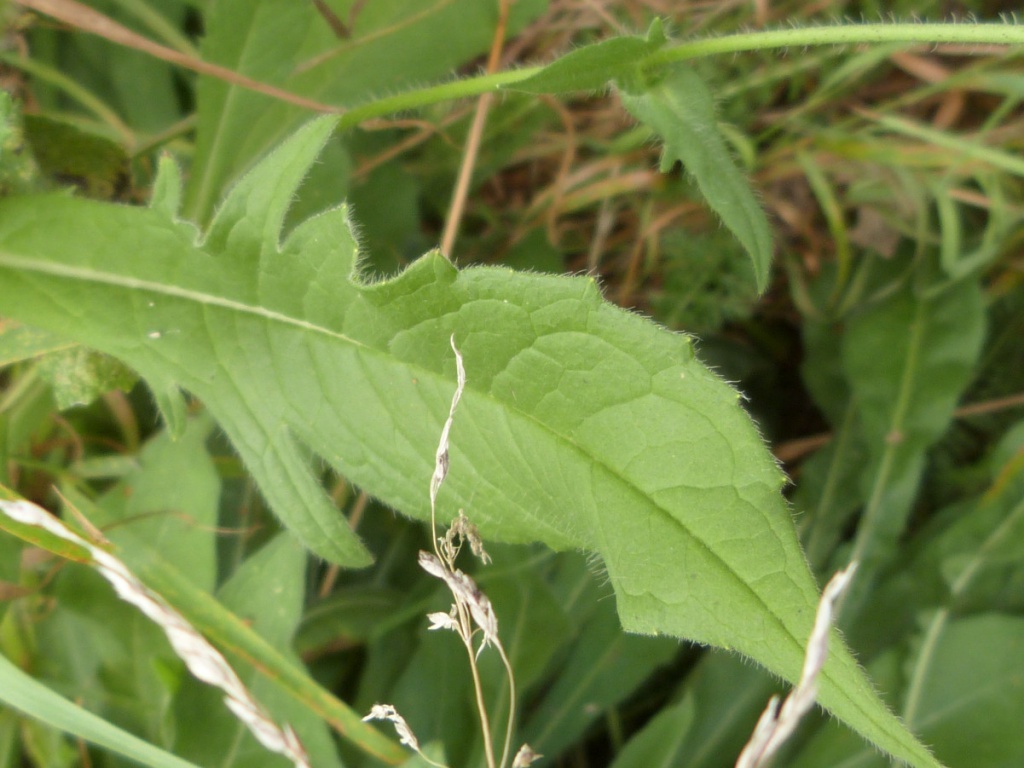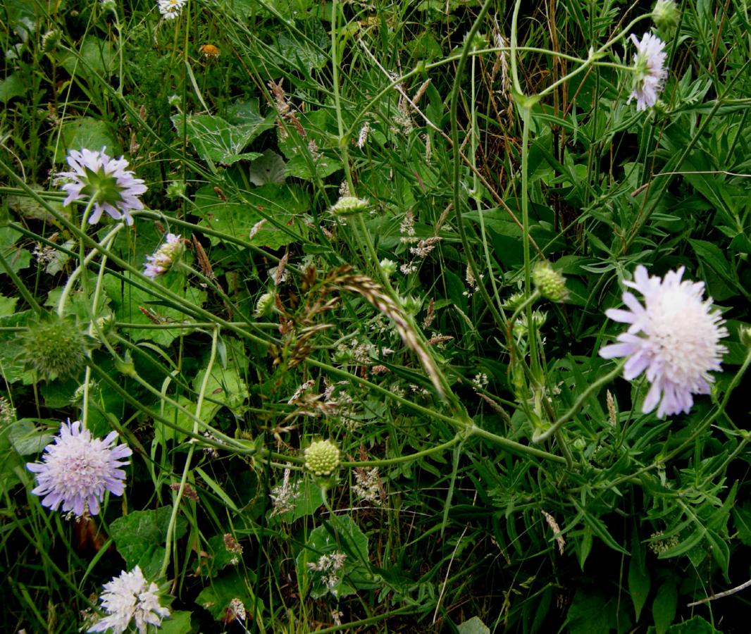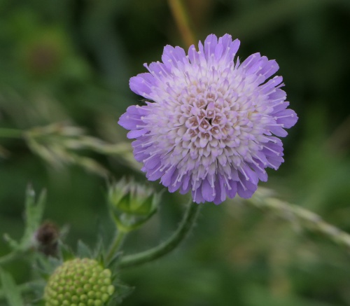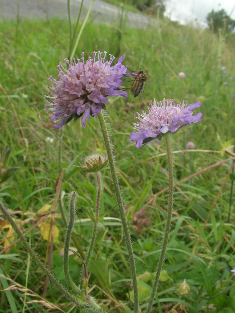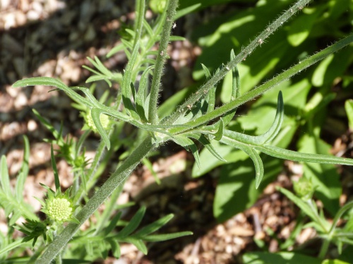 Corolla is 4-lobed (Small Scabious is 5-lobed) and the outer flowers are much longer than inner. Lower leaves simple/crenate; upper leaves pinnate, with intermediates between.