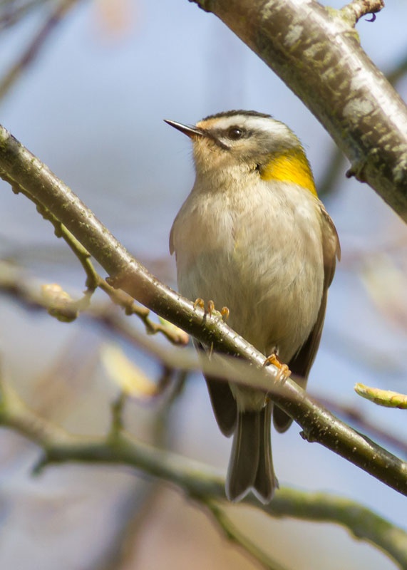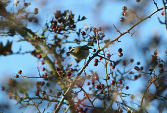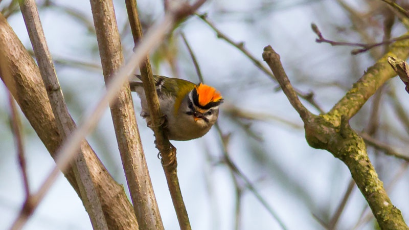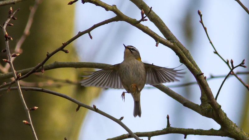 Very similar to Goldcrest (Regulus regulus) but has a broad white supercillium and dark eye-stripe. Male has orange crown stripe, female a yellow one. Both sexes have a bronze tinge to the shoulders