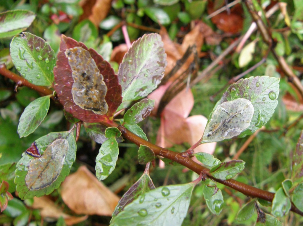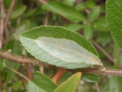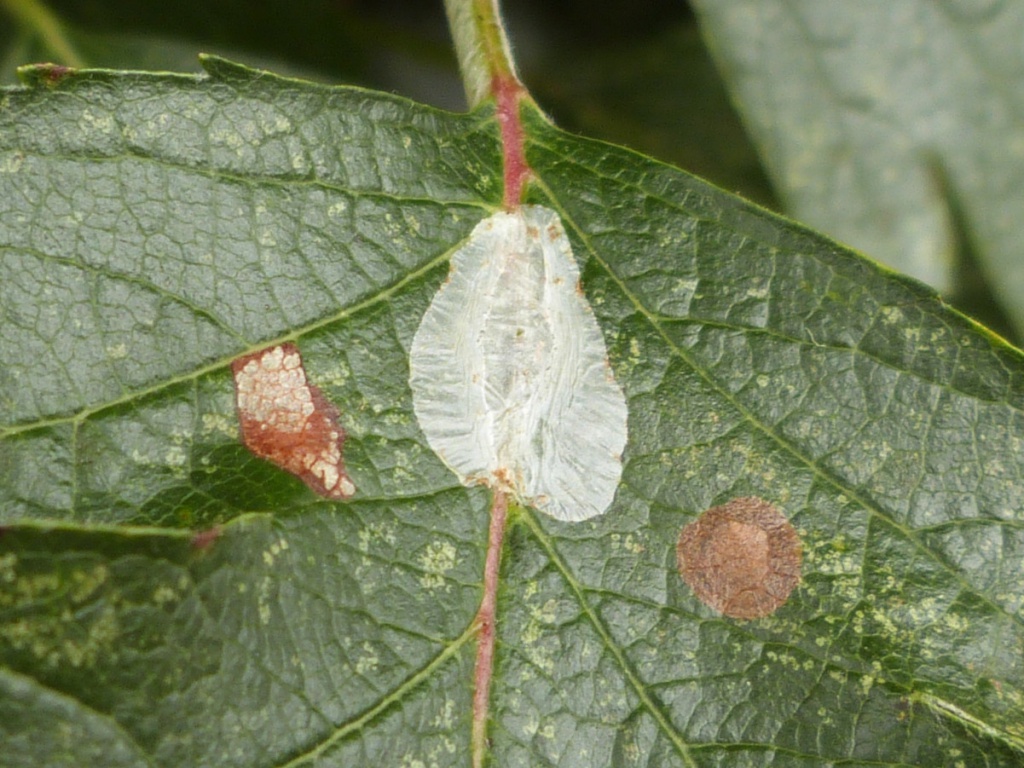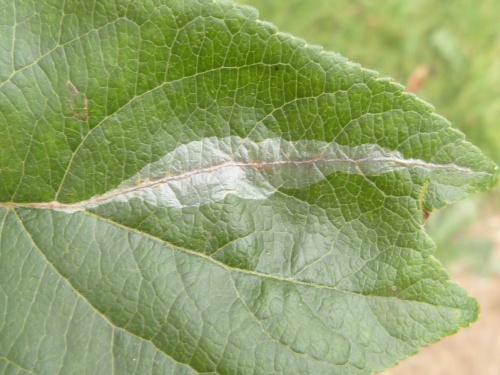 Phyllonorycter corylifoliella also causes upper-surface leaf mines on various species in Rosaceae, but when mature these are flecked with blackish frass grains