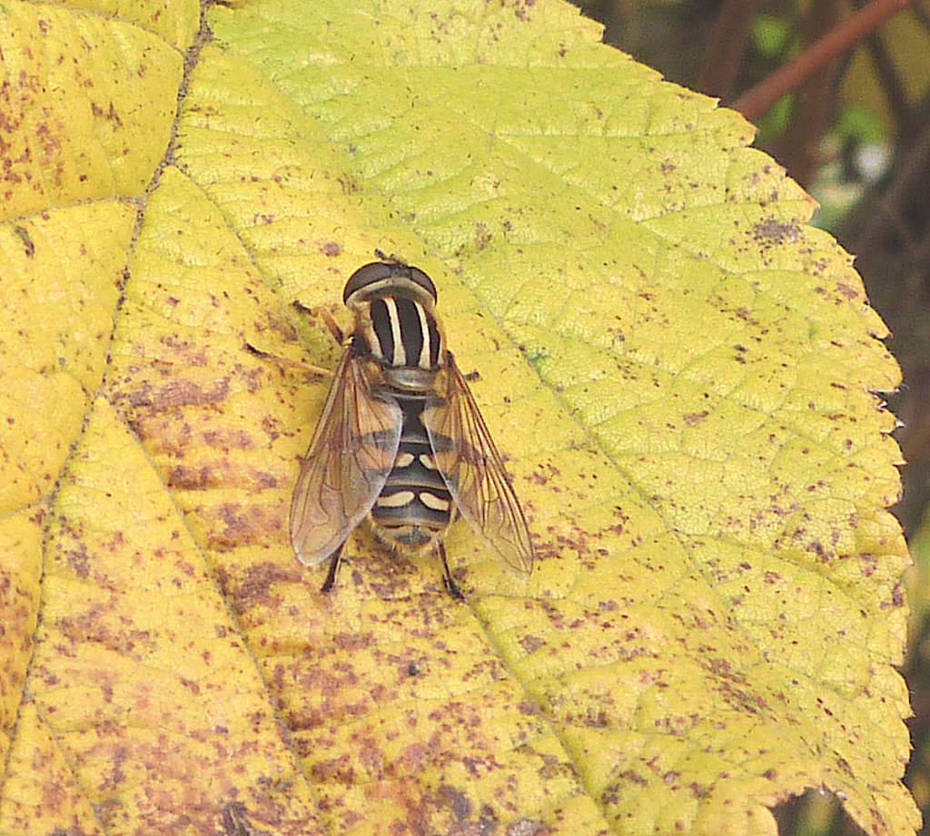 This hoverfly is sometimes called 'The Footballer' due to its stripy thorax. There are in fact several species with similar stripes which are difficult to tell apart. Another name is 'The Sunfly' due to its preference for bright sunny days. In this species the black on the hind tibia is restricted to the distal third and the mid tibia is all yellow.