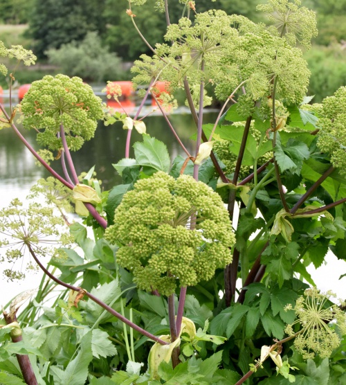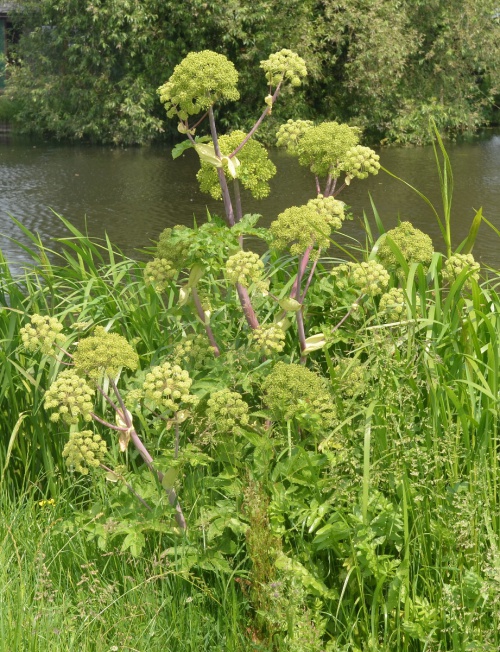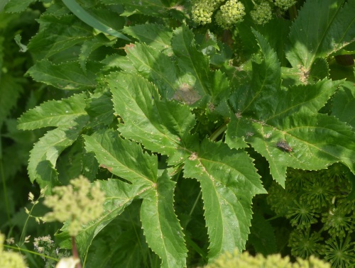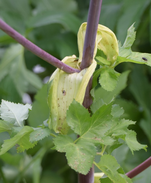 A very robust plant; glabrous, or nearly so; hollow stems; upper leaves with strongly inflated petioles, fruits flattened, oval, with thick corky wings