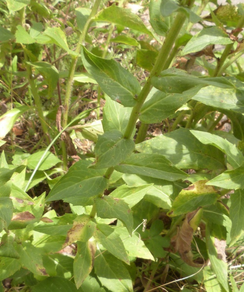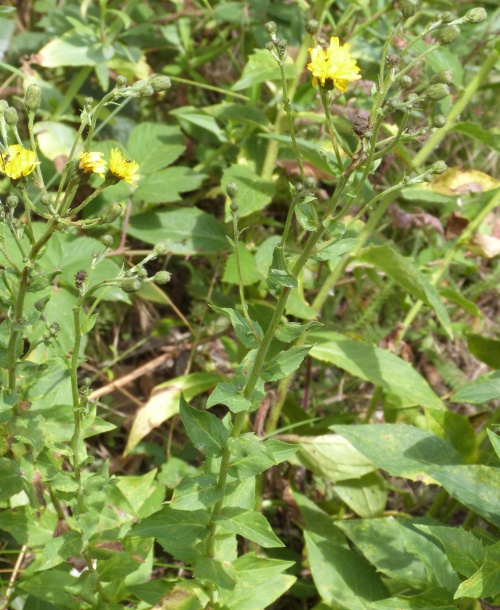 The bracts surrounding the inflorescence more or less glabrous in this species. The leaves are mostly ovate and have teeth less than 5 mm long. The styles are discoloured. Flowers yellow, in a much branched, loose panicle. Main stem with numerous leaves.