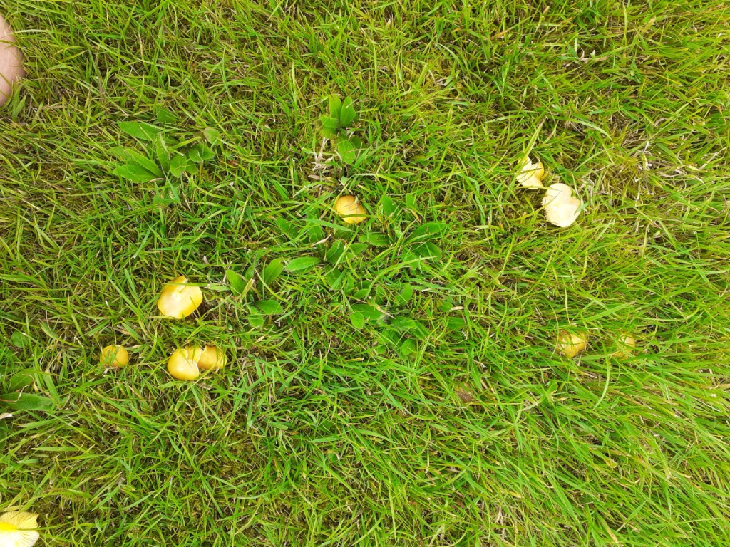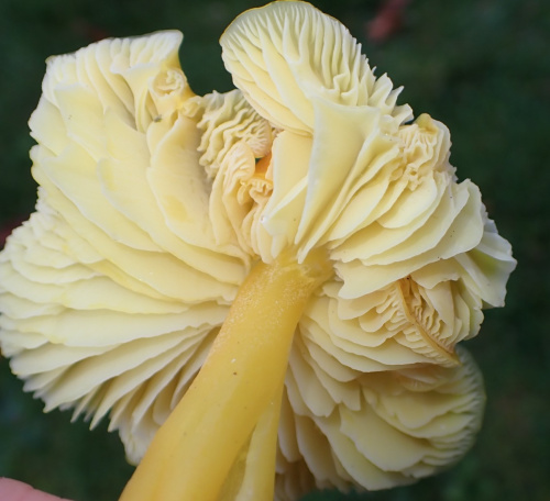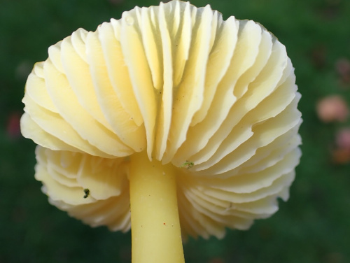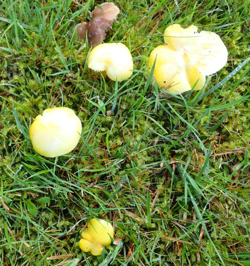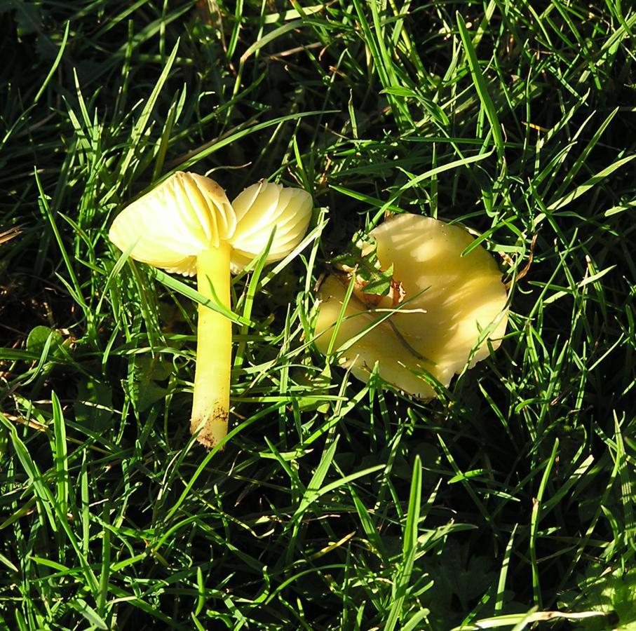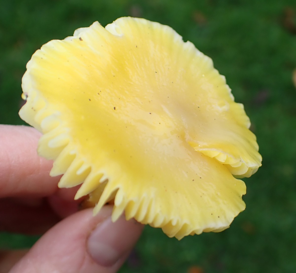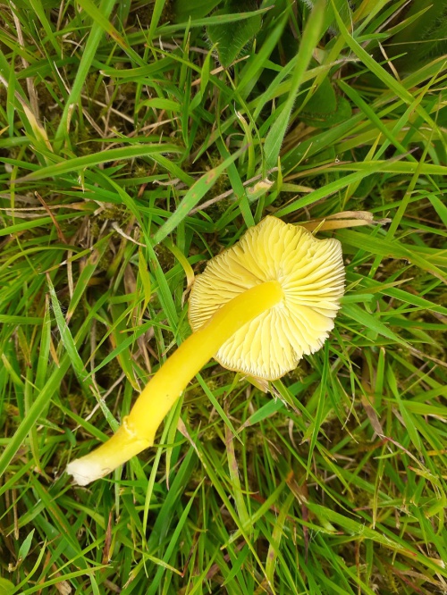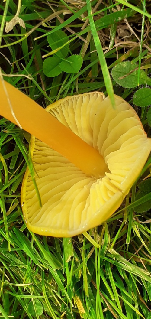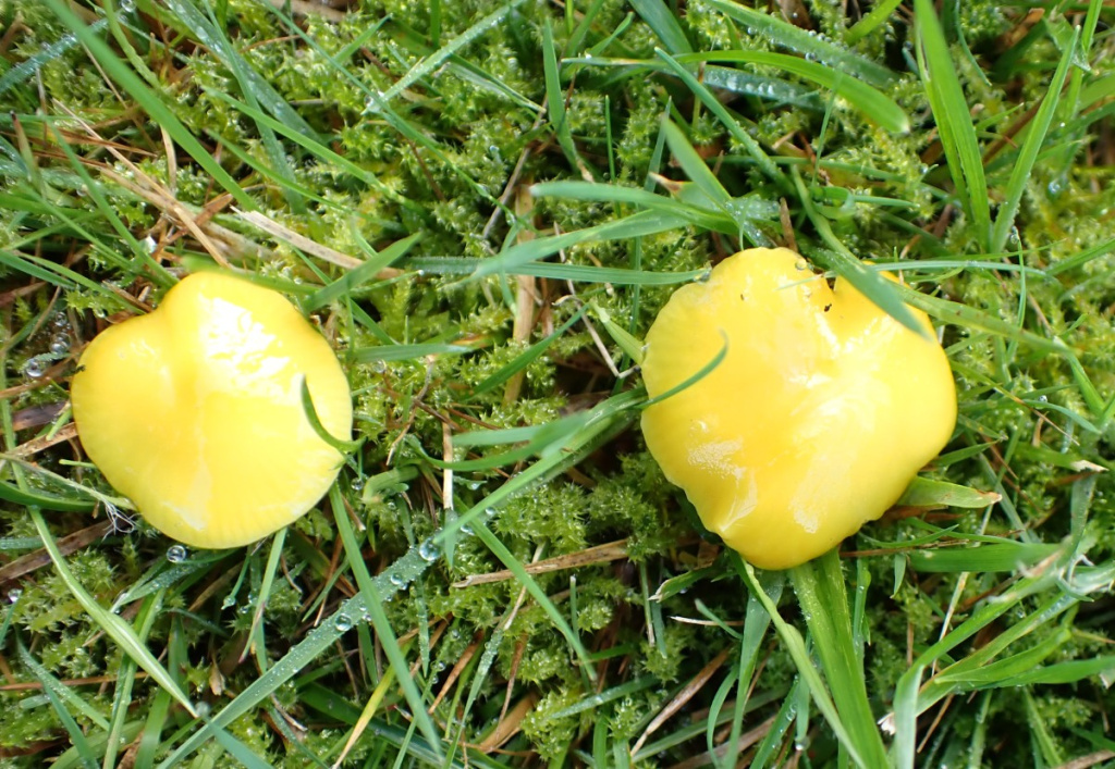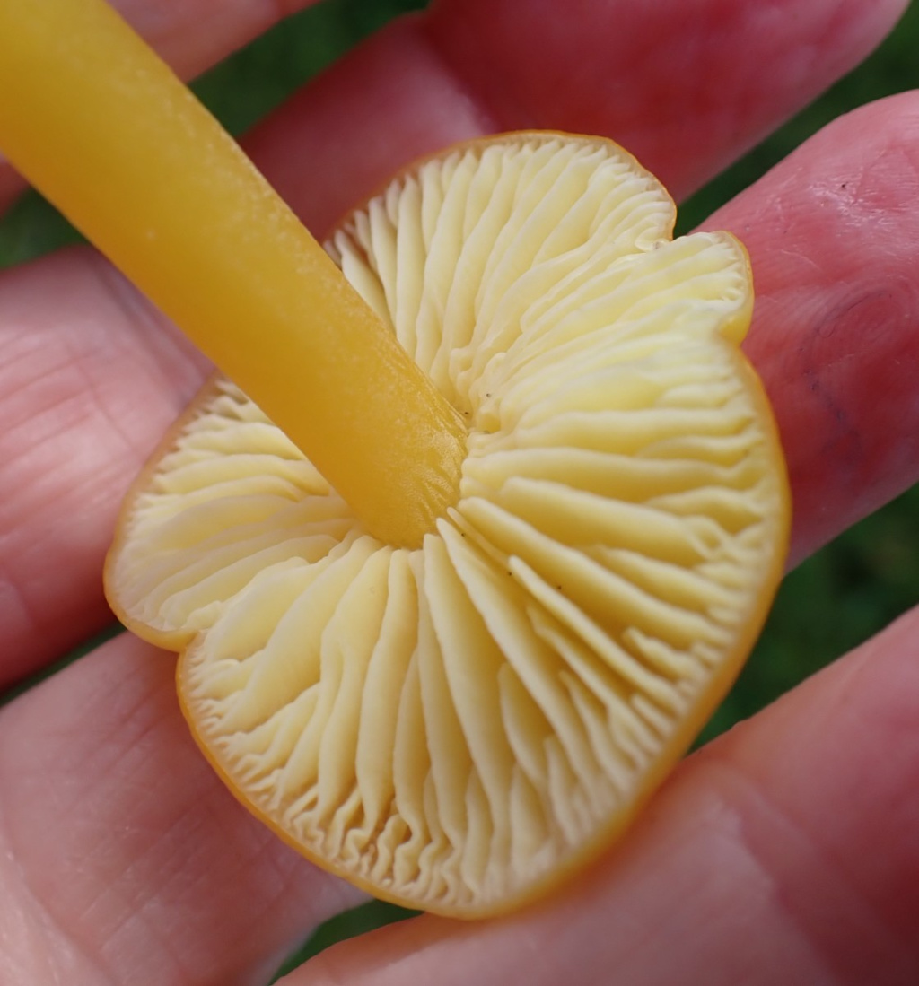 It is often confused with Butter Waxcap, which is found in similar habitats; Golden Waxcaps are often taller and larger than Butter Waxcaps, but size and shape and colour of both species is very variable. Gill attachment and texture of cap/stipe are the most helpful characteristics.