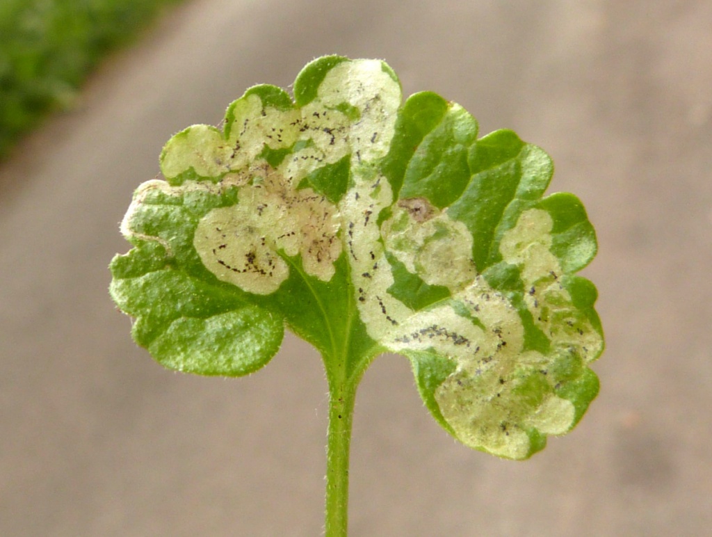 The larva of the Agromyzid fly Phytomyza glechomae mines the leaves of Ground-ivy. The leaf-mine starts with a corridor section, which widens, sometimes into a blotch, and then another corridor is made.