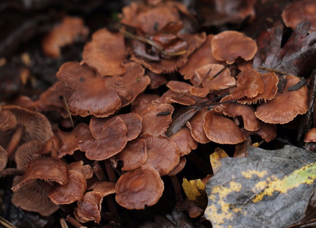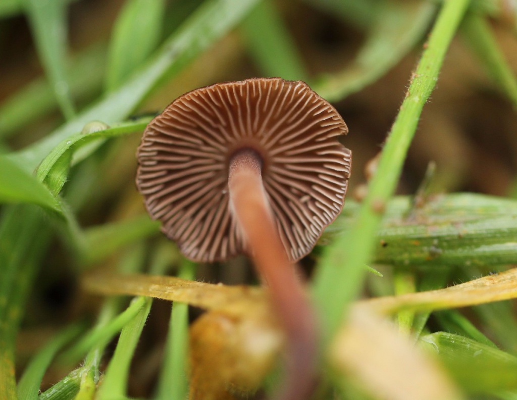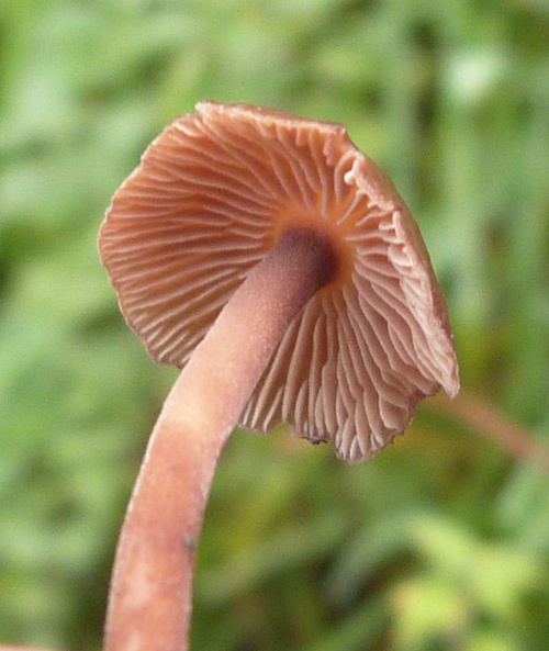 A dark pinkish brown fungus, the gills and stem are also brown and the stem base is slightly hairy.