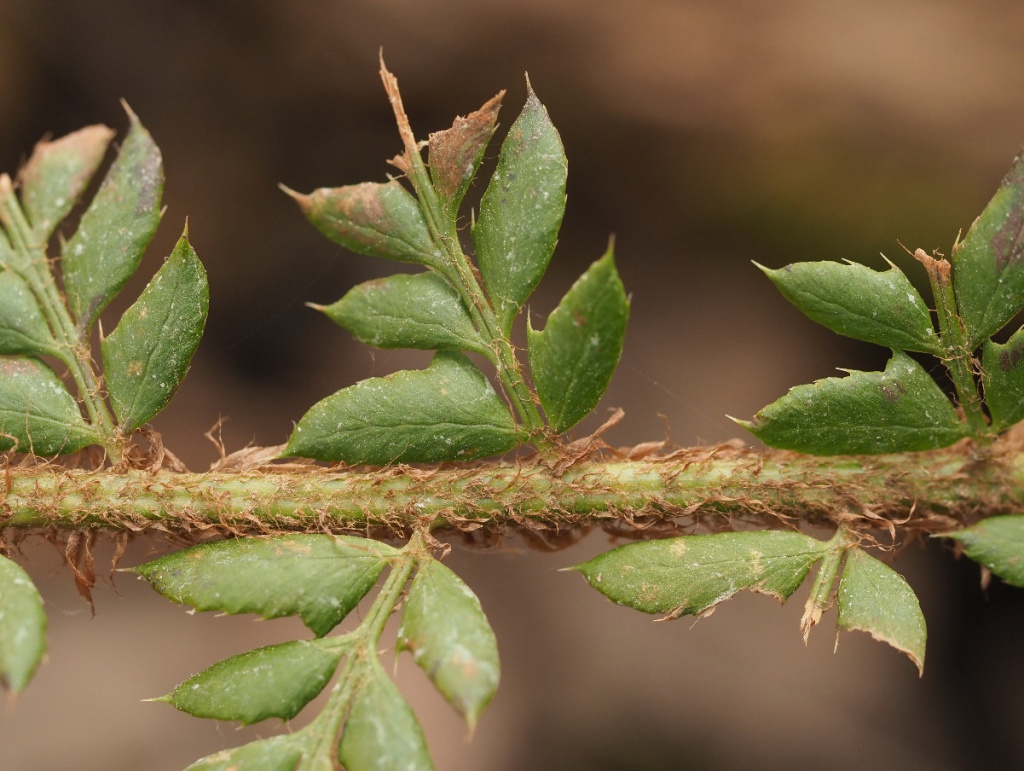 A 1-pinnate fern with deeply lobed pinnae, so having a finely divided appearance. Pinnules that have sharply pointed teeth and spine-pointed tips. In Shield Ferns the pinnae nearest the stalk are 'mitten' shaped and in Hard Shield Fern the 'thumb' angles away from the stalk, creating an acute angle. Lowest pinnae much shorter than middle ones, tapering into the stipe. Leaves stiff. Pinnules mostly unstalked or with short "stalk" which is simply a narrowing of the pinnule. Much more shiny in appearance than most ferns. Fronds exposed to the light are sometimes pale green, but mostly they are darker green especially those in shady crevices.