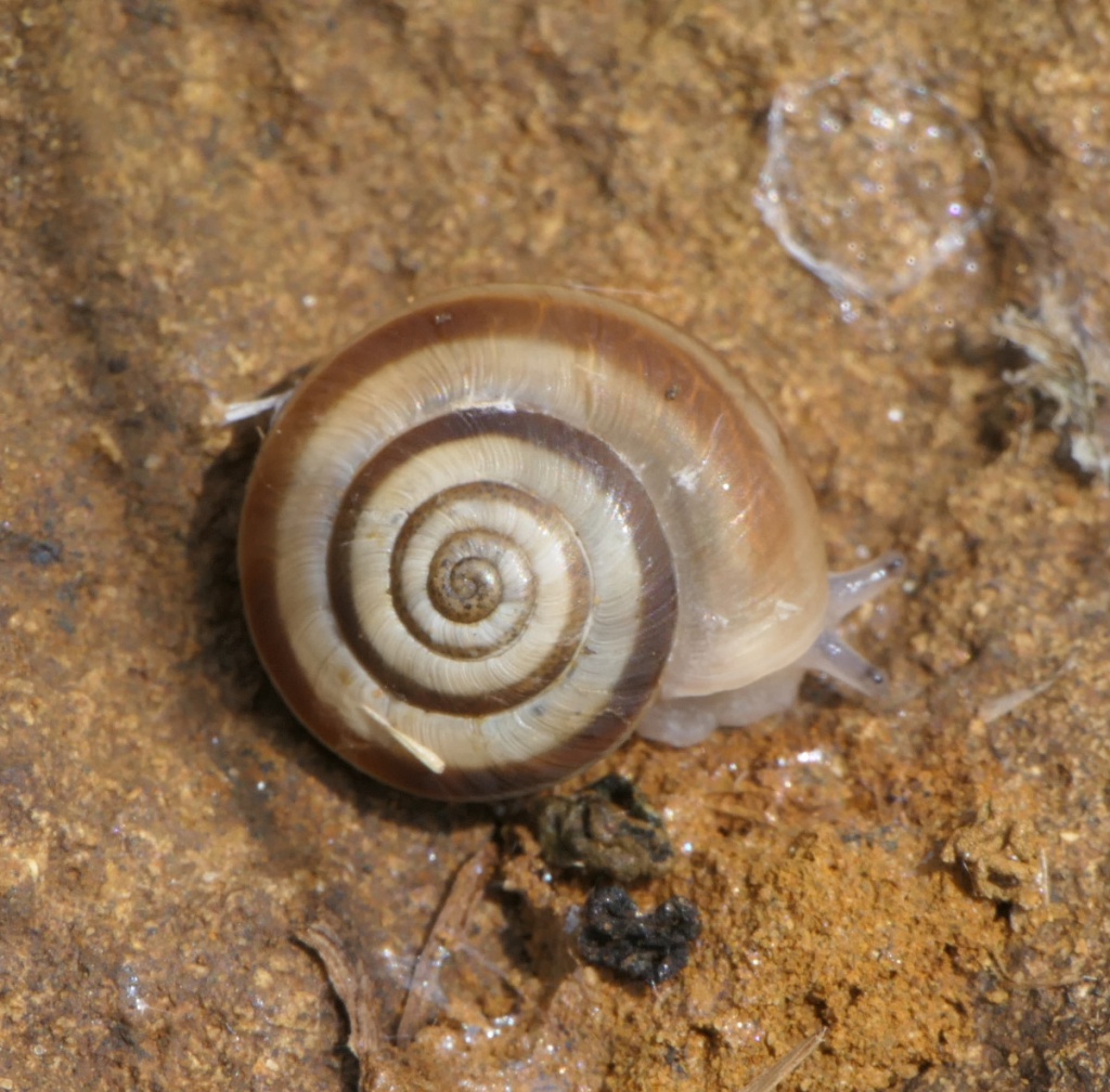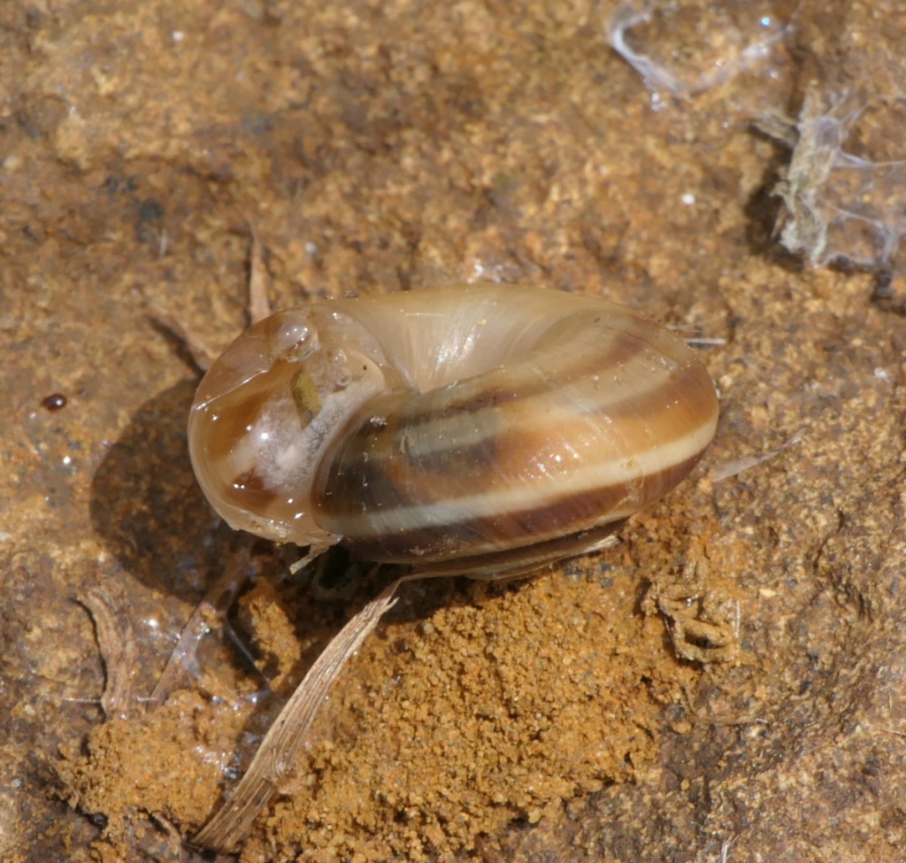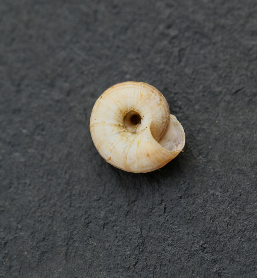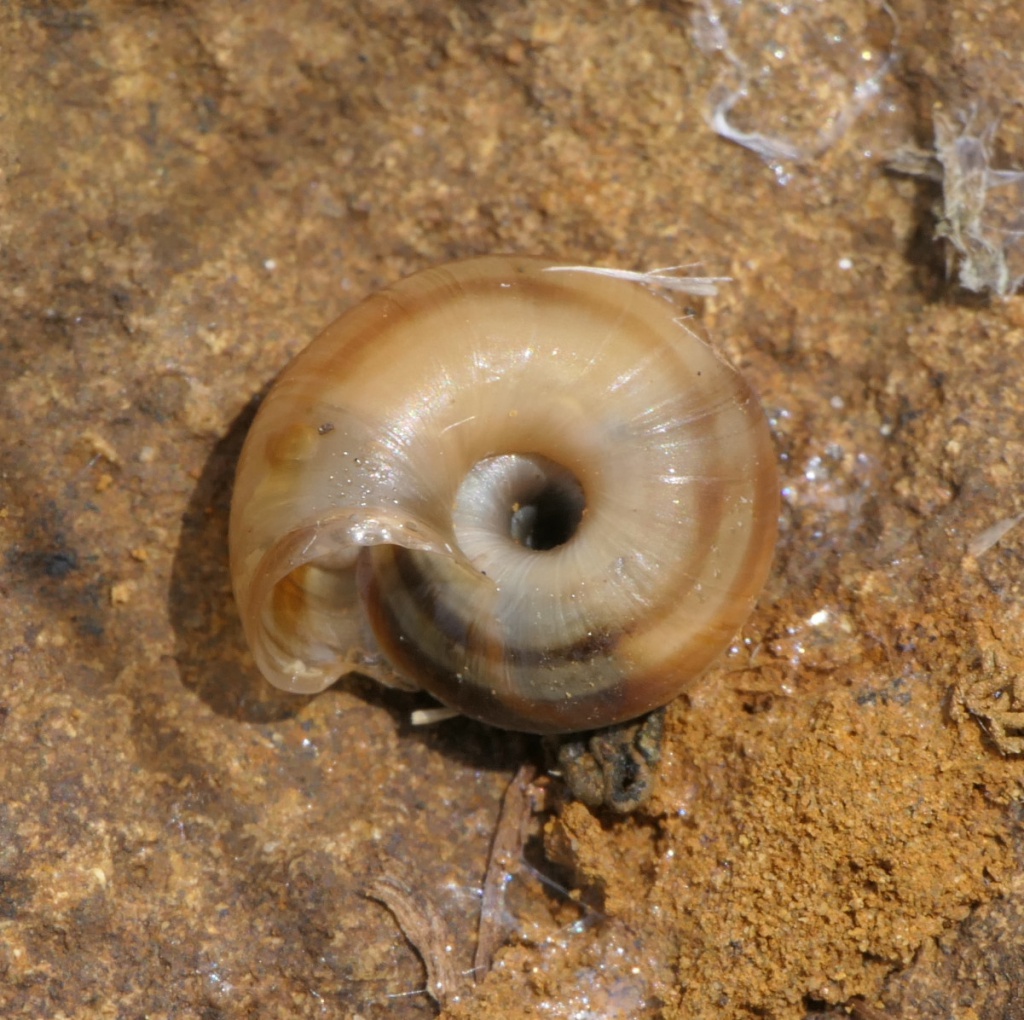 9-25mm diameter with a low spire. Generally pale but usually with dark spiral bands. It has a large umbilicus that is free from the mouth lip.